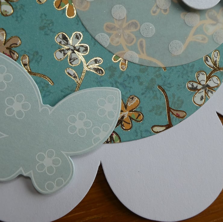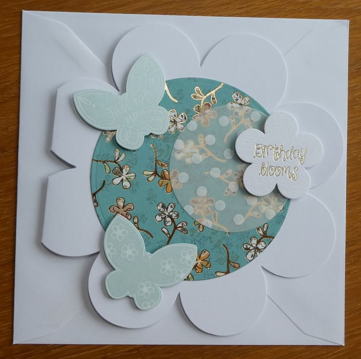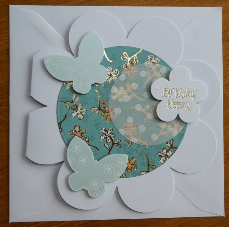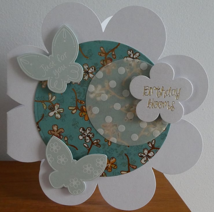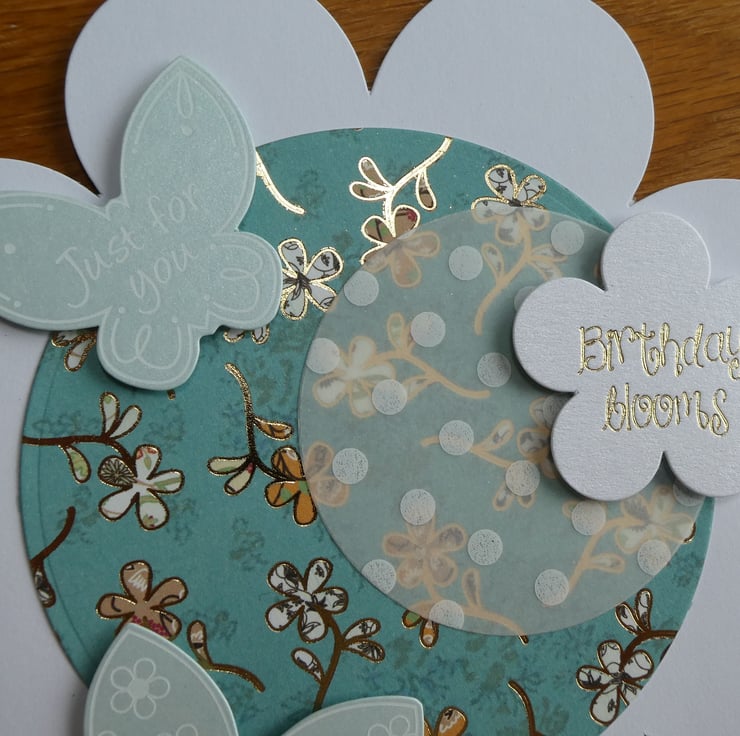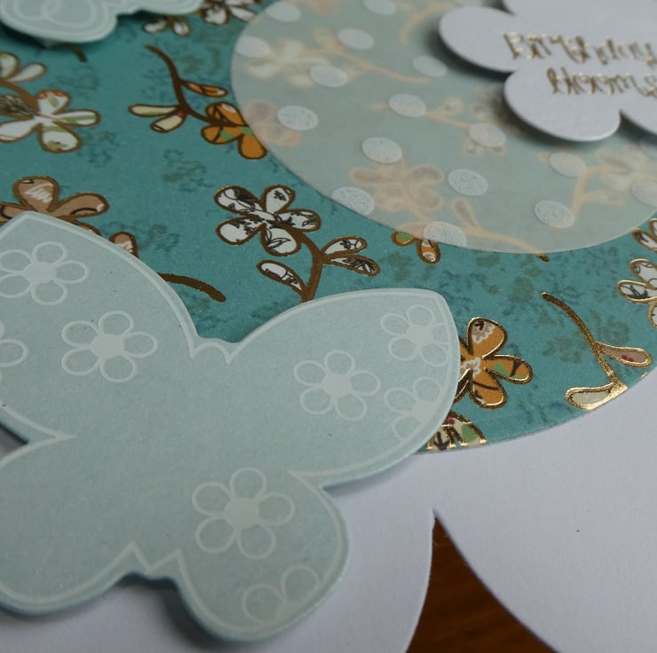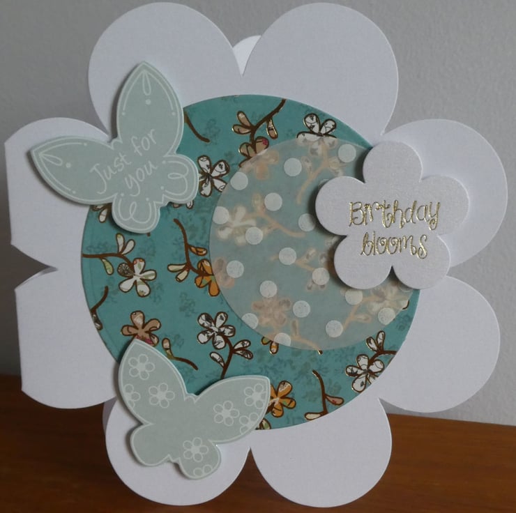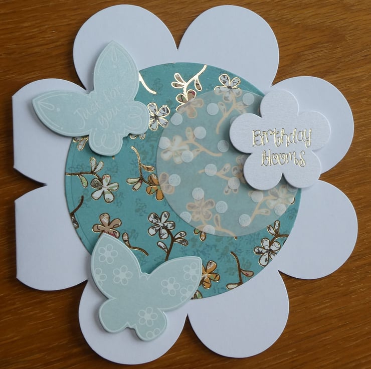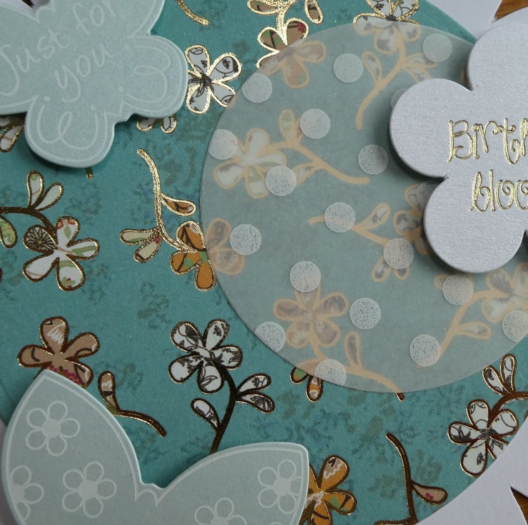 This has then been layered with a circle of dotty patterned vellum, 2 pearlescent butterflies with white scroll details and a flower shaped message with the words 'Birthday Blooms' in gold metallic font.