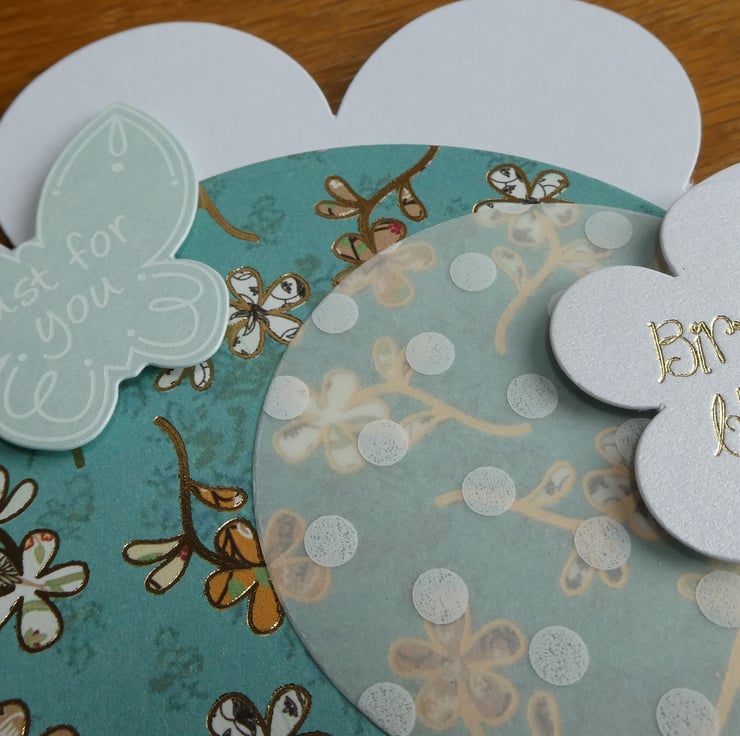 It has a circle of bright green/blue floral patterned card with gold metallic detail in the centre.