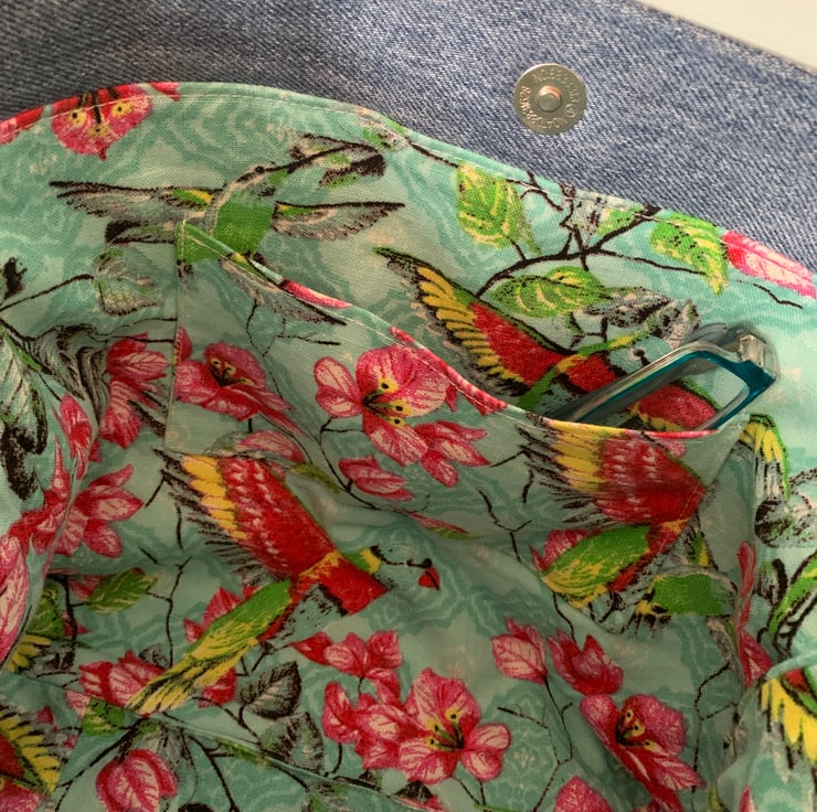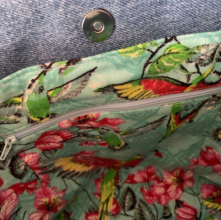 Light blue/multi cotton/linen lining with beautiful tropical bird/flower design. Internal zip pocket and slip pocket.