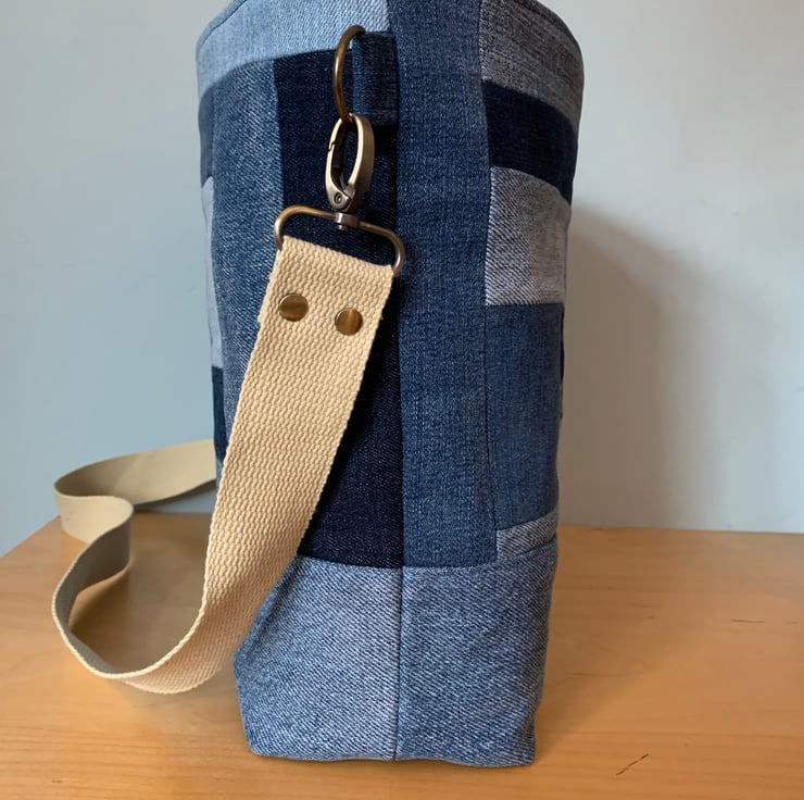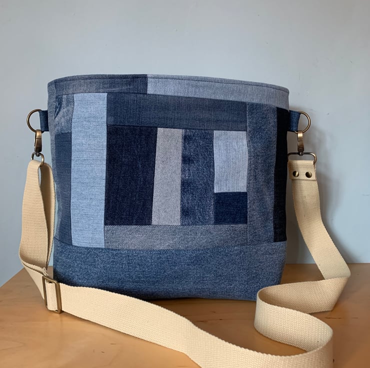 Handpieced denim patchwork design using recycled denim fabric. Extremely sturdy and roomy slouch bucket bag.