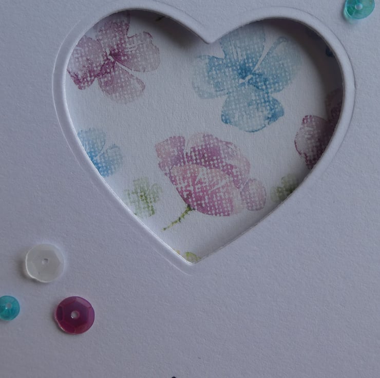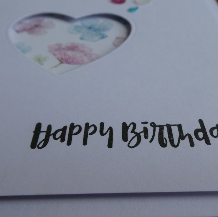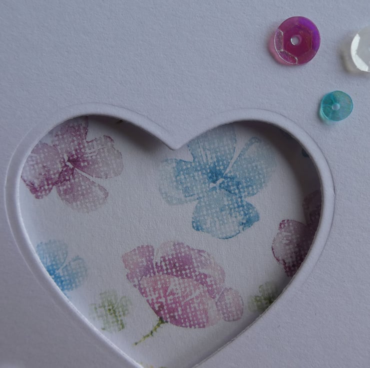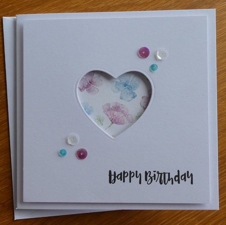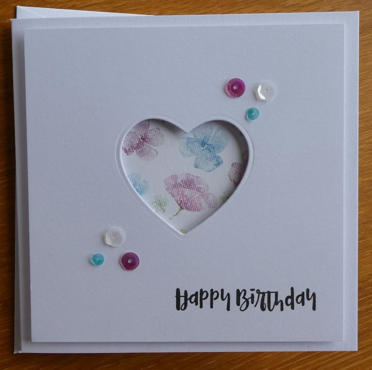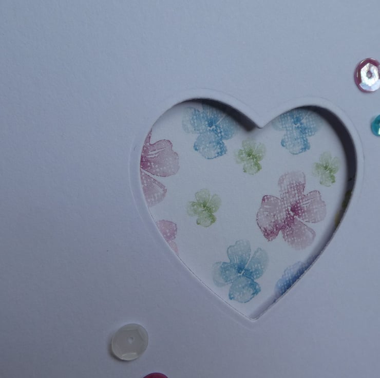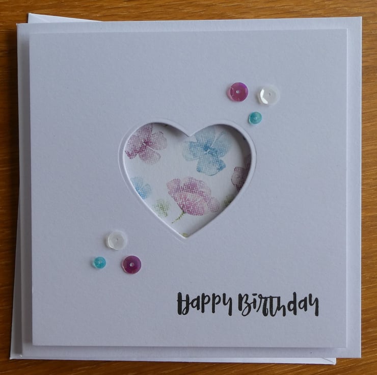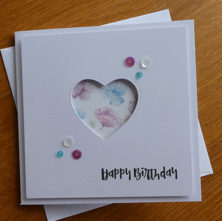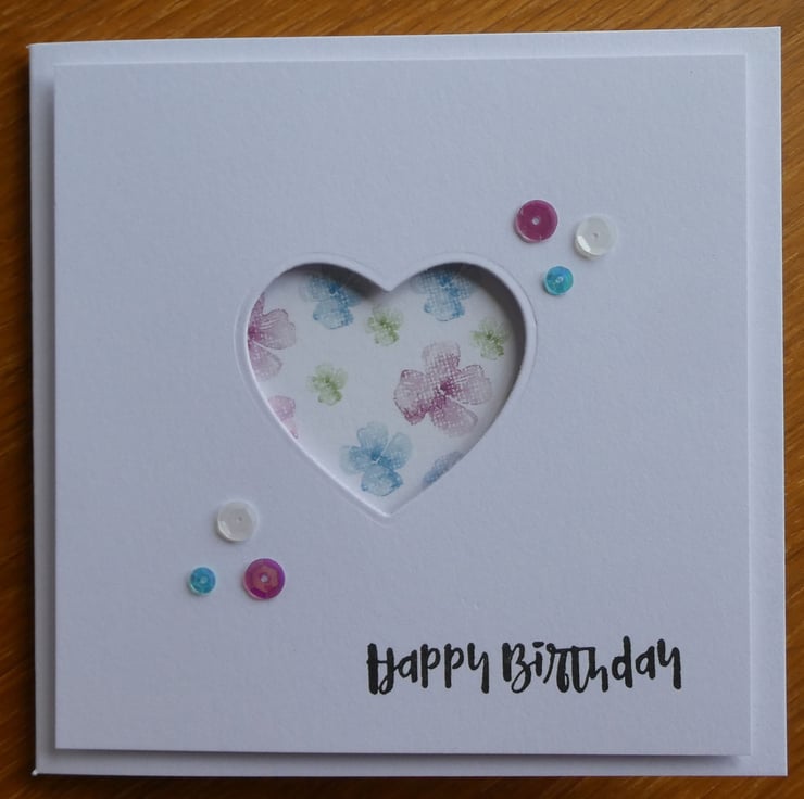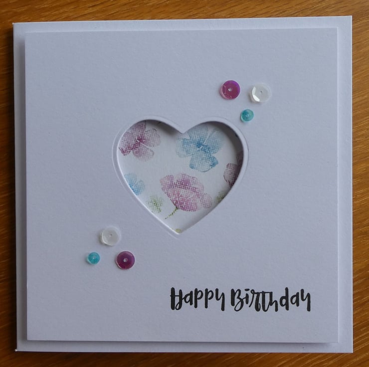 This simple and elegant birthday card has a floral background card in shades of pink, blue and green which can be seen through a heart shaped aperture.