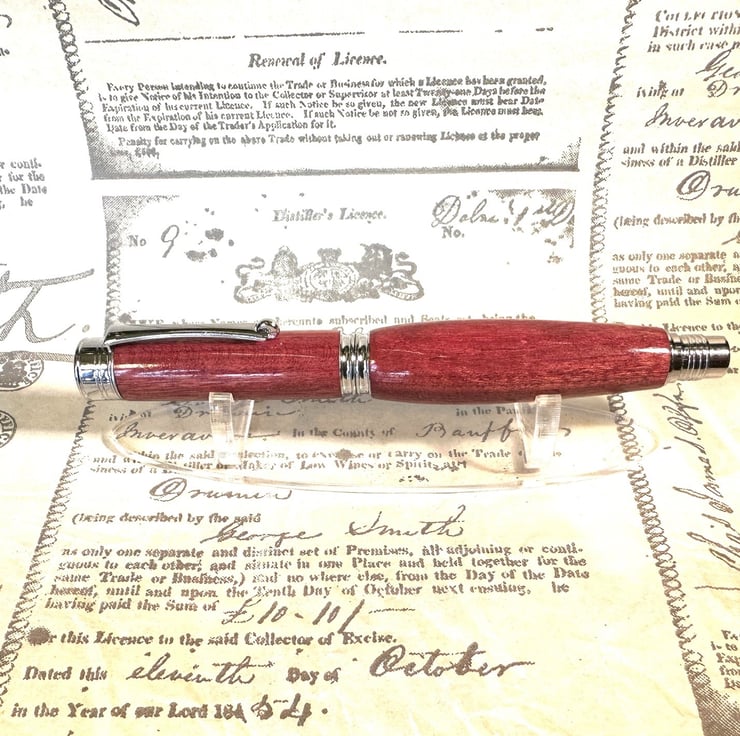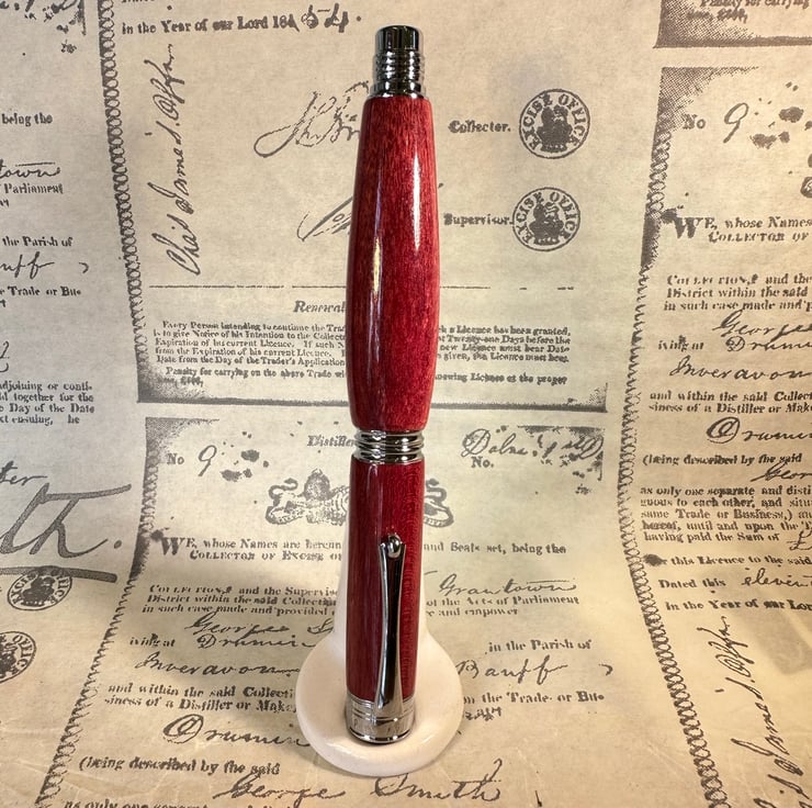 This is a Byron Rollerball pen in Chrome with a Purpleheart body finished in a lacquered and polished coating; features a rotating wheel pocket clip, comfort grip nib section. Purpleheart is a hardwood from the Central and South America regions.