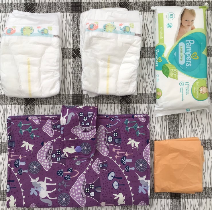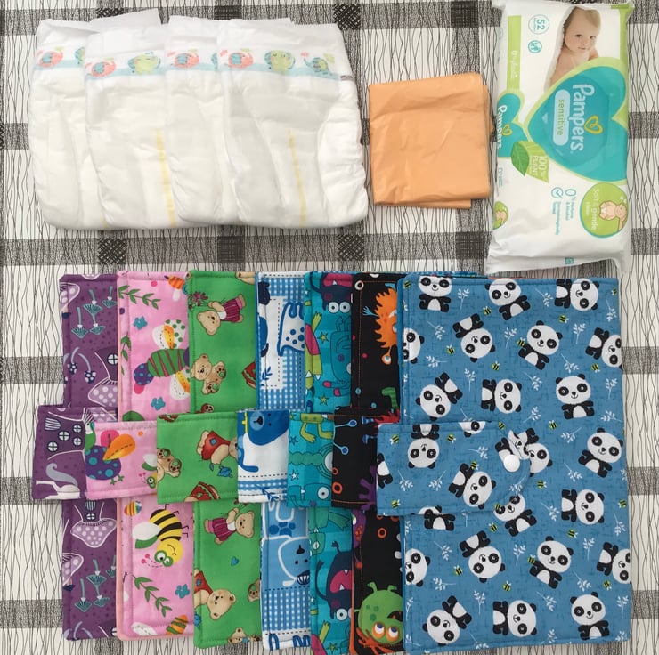 Press stud fastener. Complete with, 4 x nappies, baby wipes & nappy bags. Please chose colour/pattern from picture.