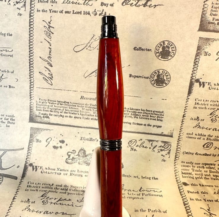 This is a Byron Rollerball pen in Dark Chrome with a Padauk body finished in a lacquered and polished coating; features a rotating wheel pocket clip, comfort grip nib section. Padauk is a tropical hardwood from the West African region which has a beautiful orange/red colouring.