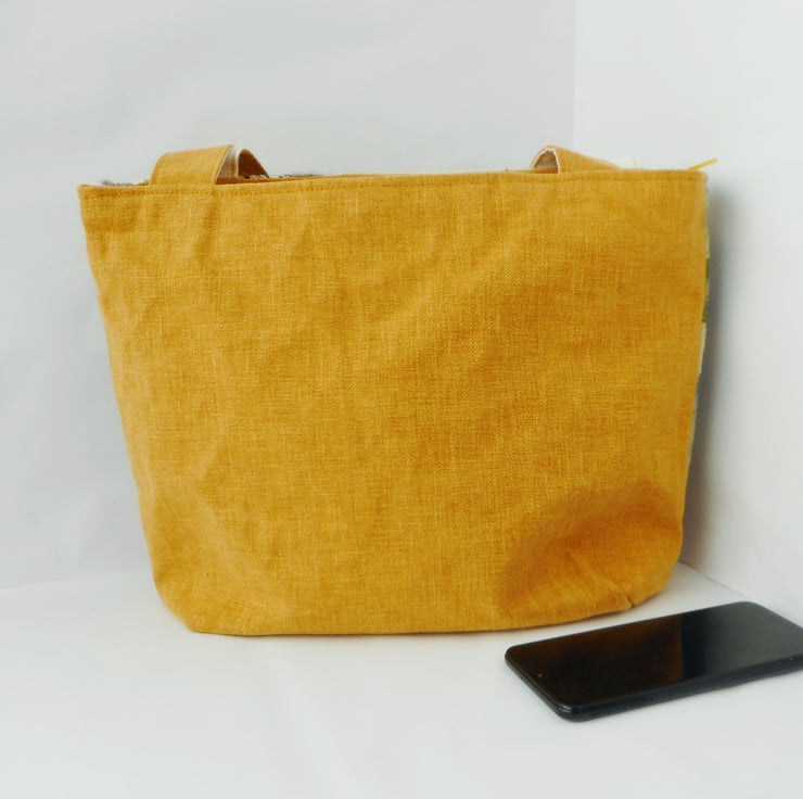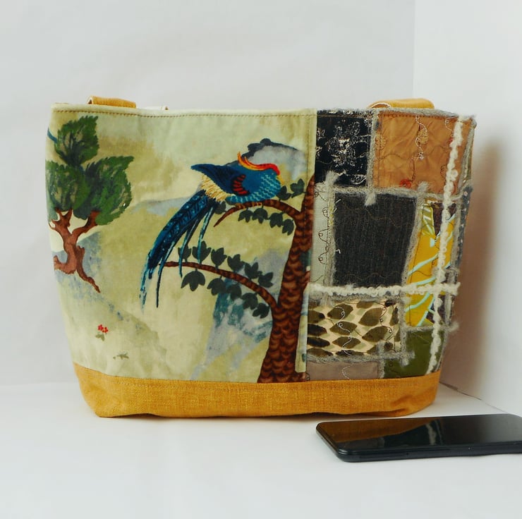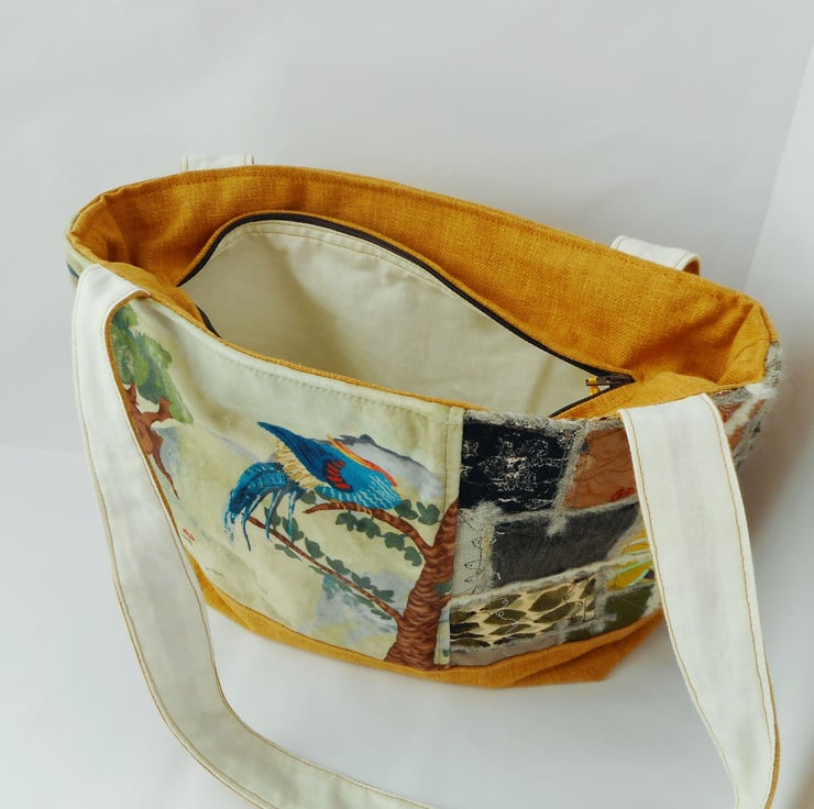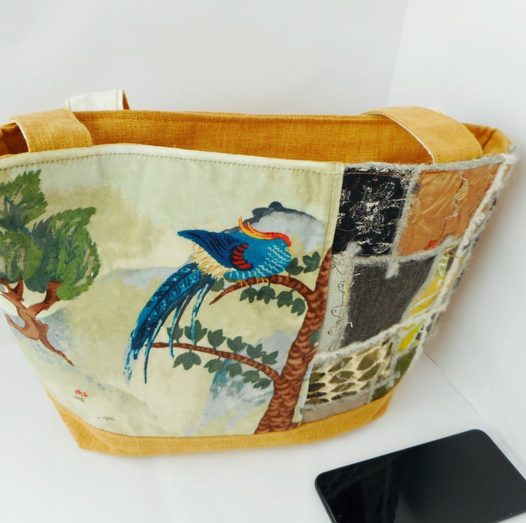 Made from mixed fabrics. The main fabric is a mustard yellow furnishing fabric. The front panel is pieced together. The larger section is made from offcuts of furnishing weight velvet with an exotic pheasant print - Aesop velvet, by Linwood Fabrics. It is 100% cotton velvet and is a handpainted design. Retail cost is around £200/m.
