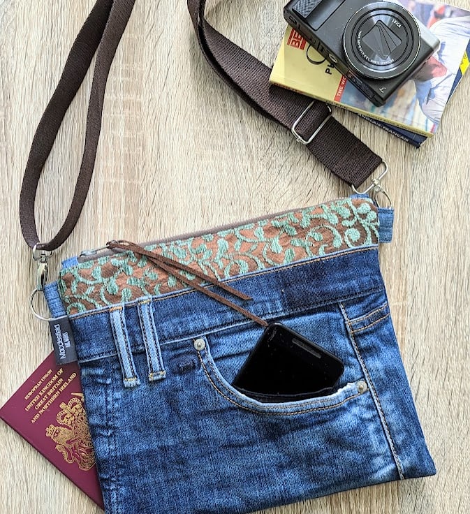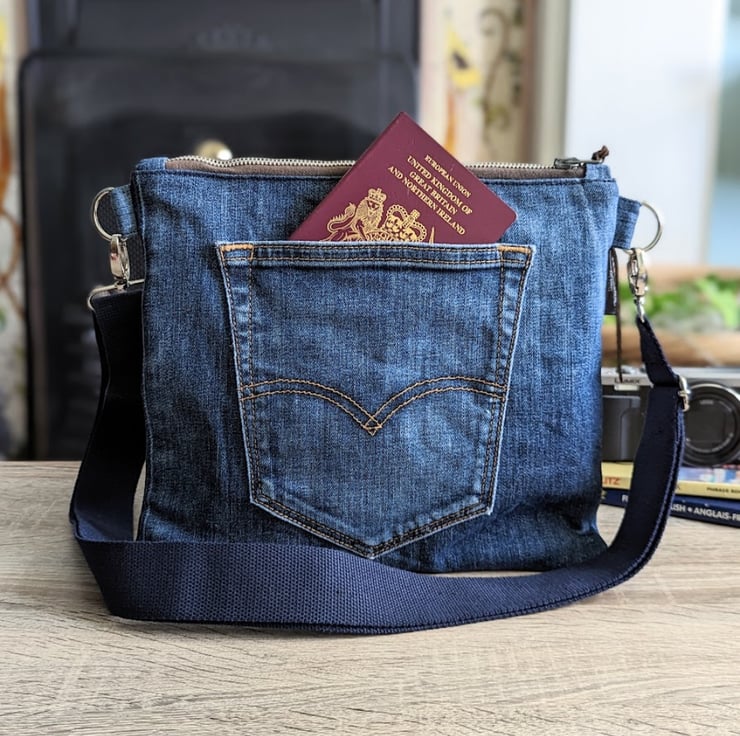 The front of the bag has a panel made from sections of recycled denim - features from the original jeans include a functional pocket, section of waistband and belt loops.
