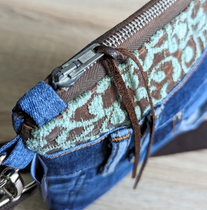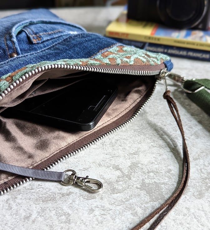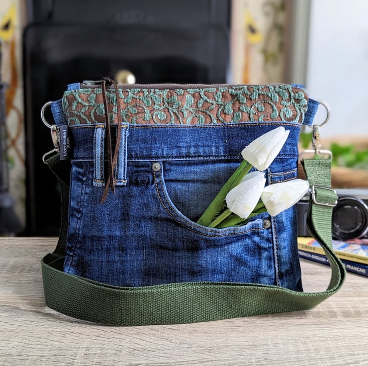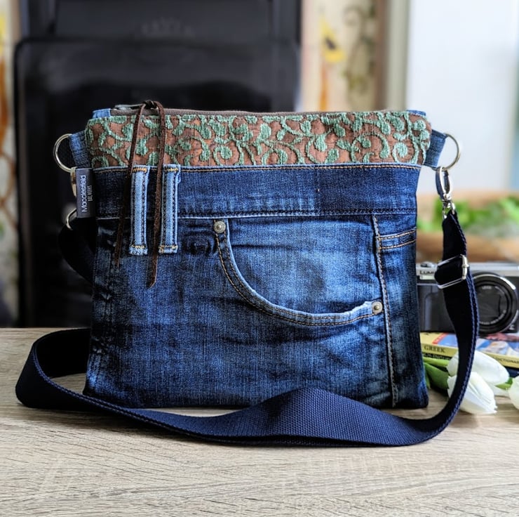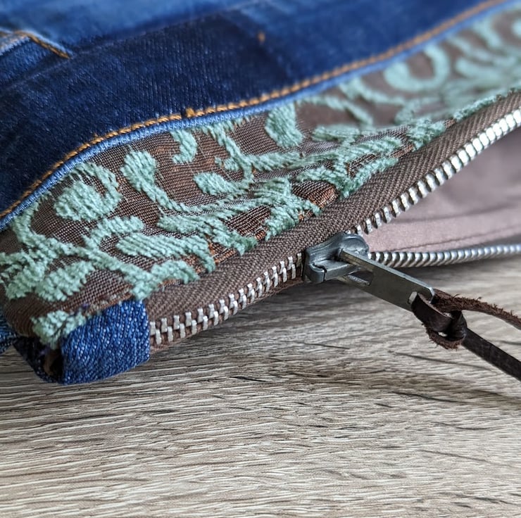 Casual and slim fitting, this opulent little cross body bag has been made from pre-loved denim jeans and chenille damask the colour of....I can only describe it as....chocolate limes! It's lined with a heavy weight chocolate brown silk.