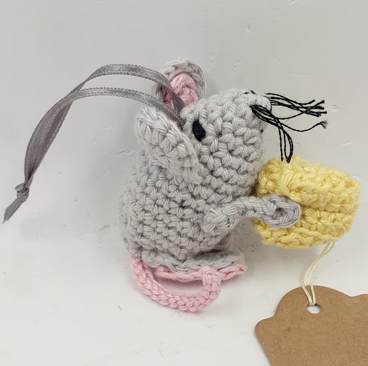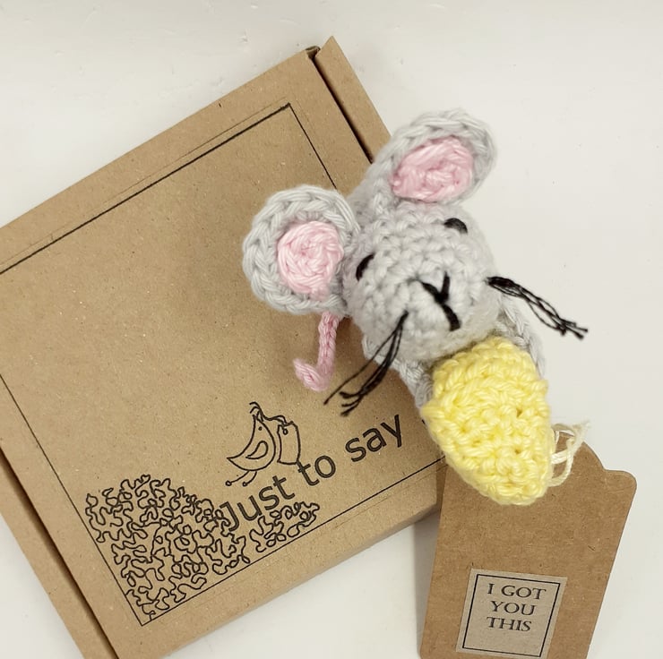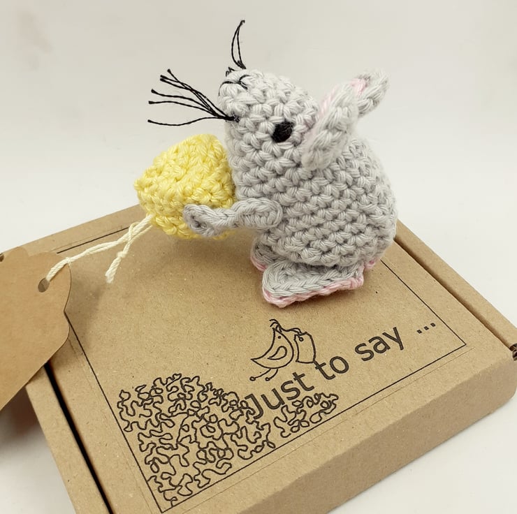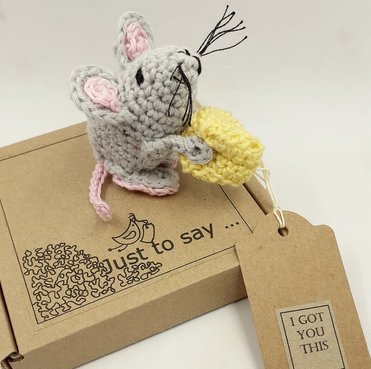 This little grey mouse is all set to deliver a message on your behalf. It is crocheted and embroidered in cotton and filled with polyester stuffing. There is a narrow ribbon hanging loop ( please see last photo.) The mouse carries a gift of cheese in its paws and the label reads, I Got You This, although I am very happy to exchange this tag for one with wording of your choice. The mouse measures approximately 5.5cm tall and comes nestled in shredded tissue paper in a labelled PIP ( Postage in Proportion) box all ready to be given or posted on.