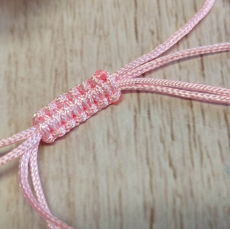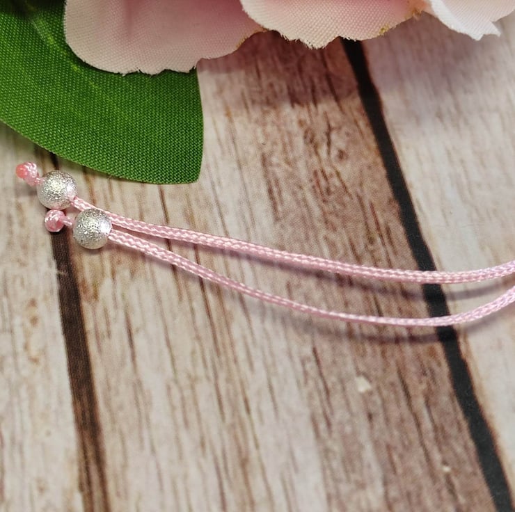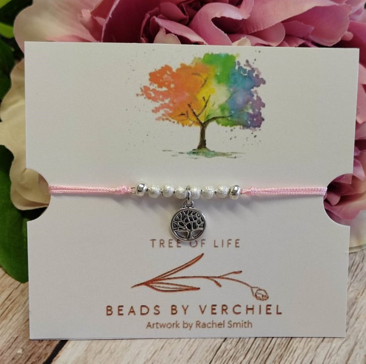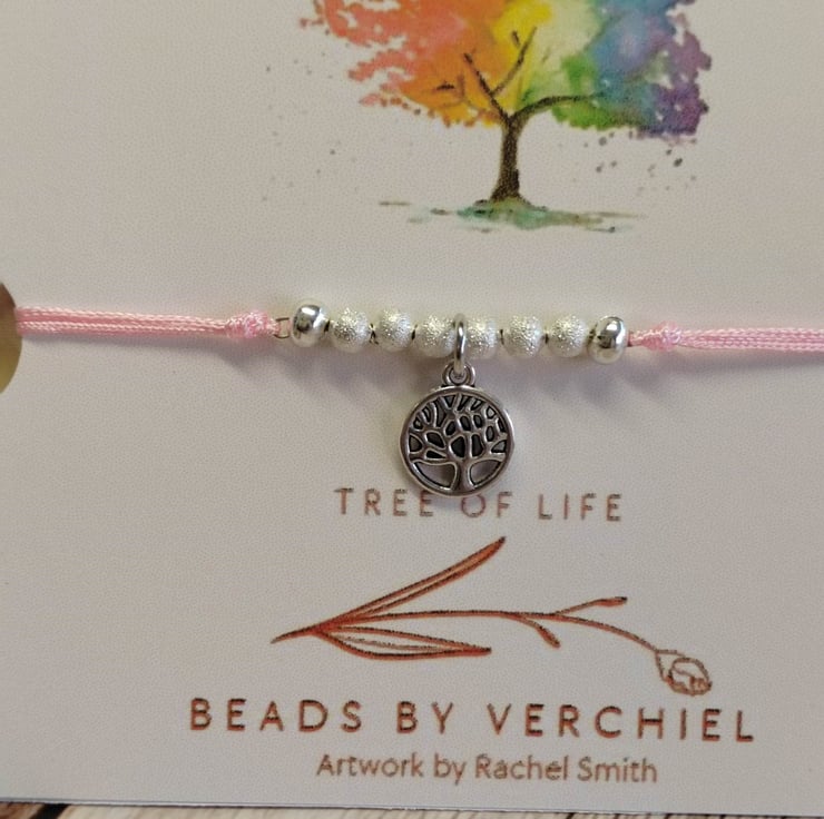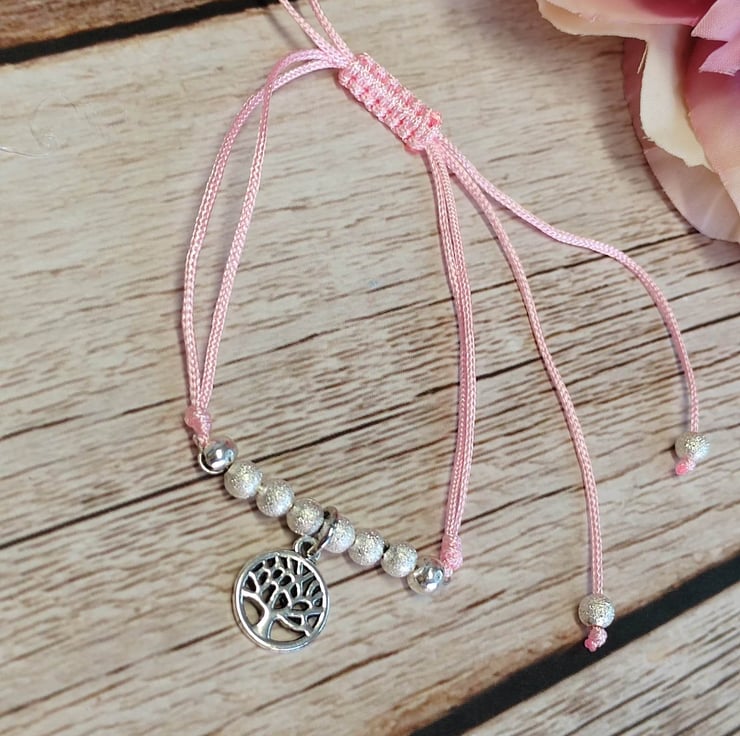 Bracelet with alloy tree of life charm with satin polyester cord and 4mm brush silver splated beads. Adjustable macrame section making easy to put on and off. Decorative silver plated polished 4mm beads on all 4 threads.