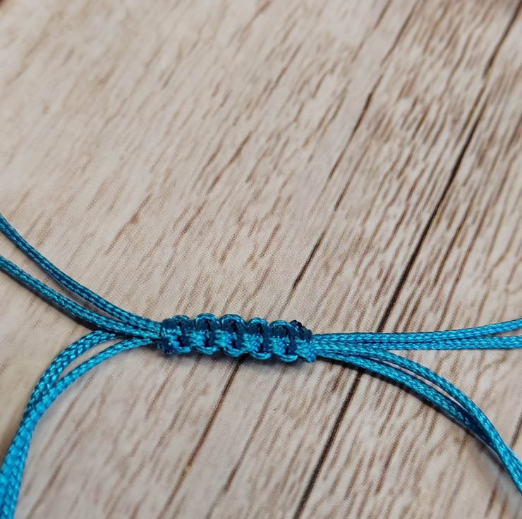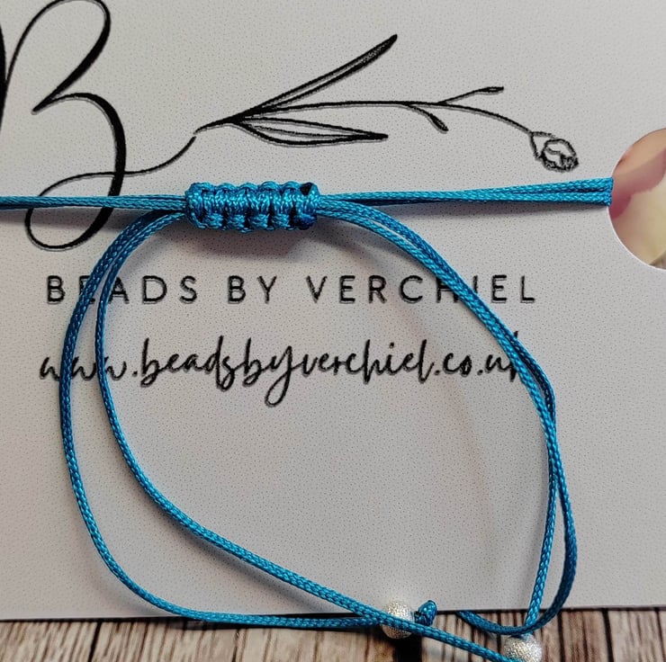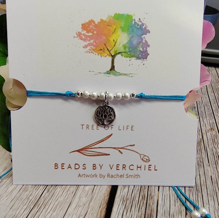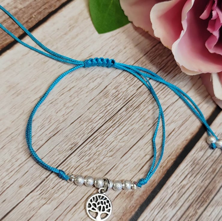 Bracelet with alloy tree of life charm with satin polyester cord and 4mm brush silver splated beads. Adjustable macrame section making easy to put on and off. Decorative silver plated polished 4mm beads on all 4 threads.