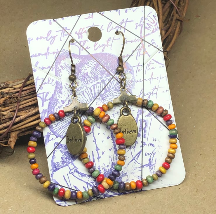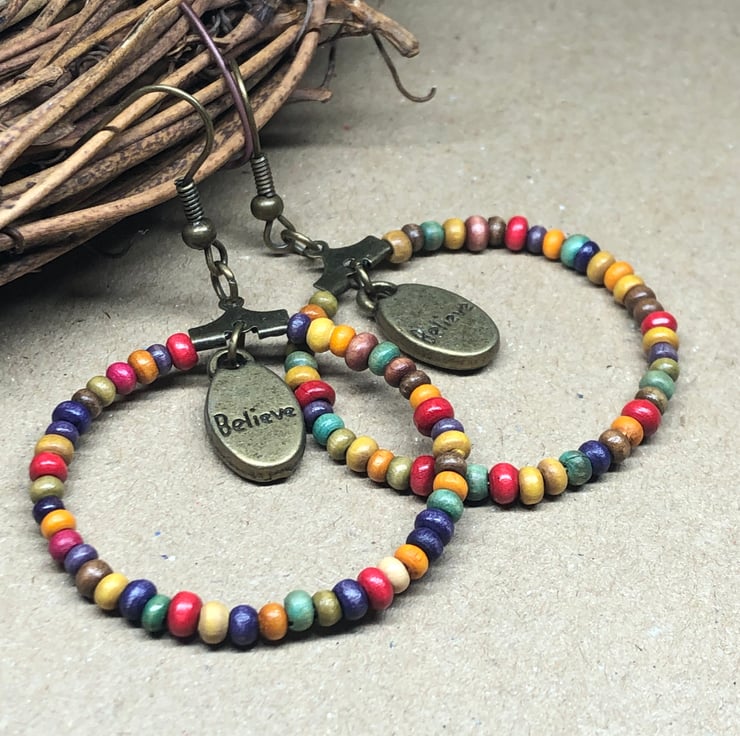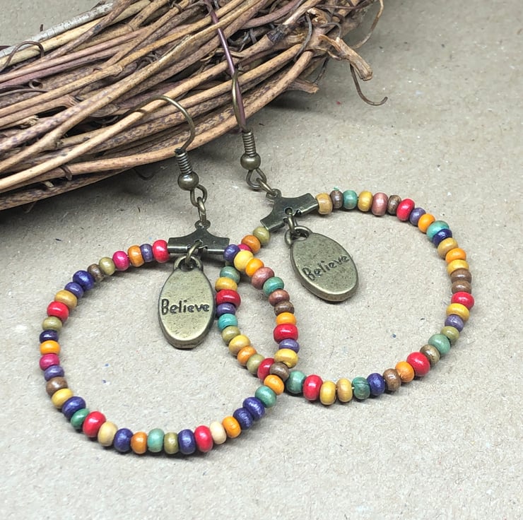 Wooden rainbow hoop earrings with Believe charms.