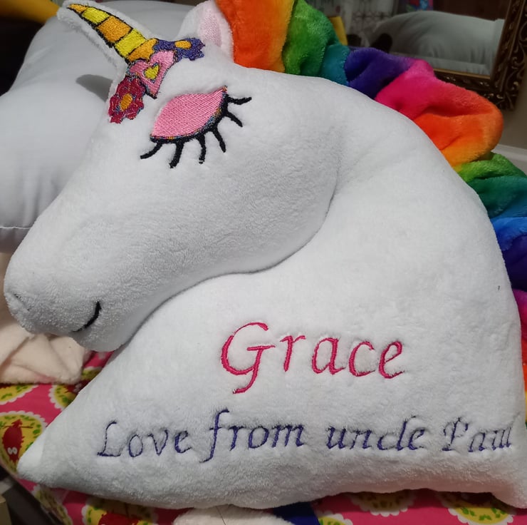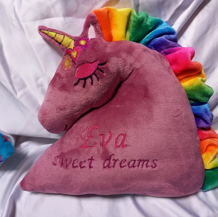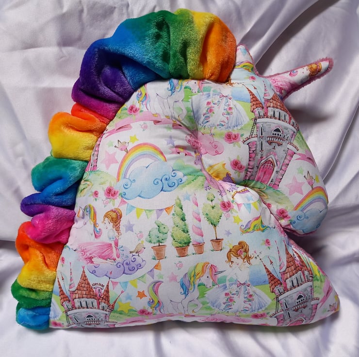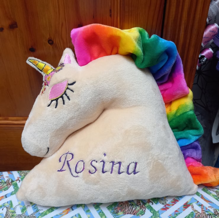 Cuddly cushion made from white fleece for the head, rainbow fleece for the mane, embroidered top side and cotton backing. Perfect gift for a little girl or boy. Boyish unicorns can be made in a blue colour scheme.