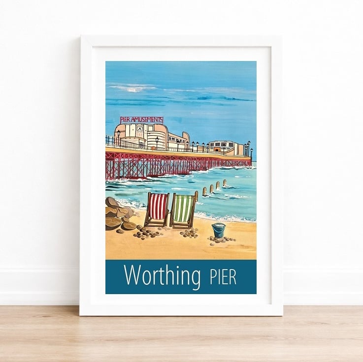 A contemporary travel poster style print of Worthing's lovely Pier, from my own original acrylic painting. A perfect gift for those who love Worthing!