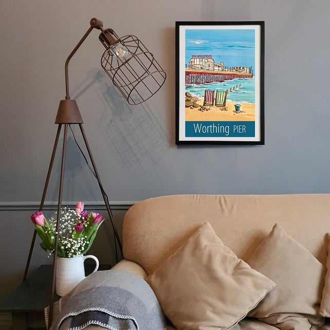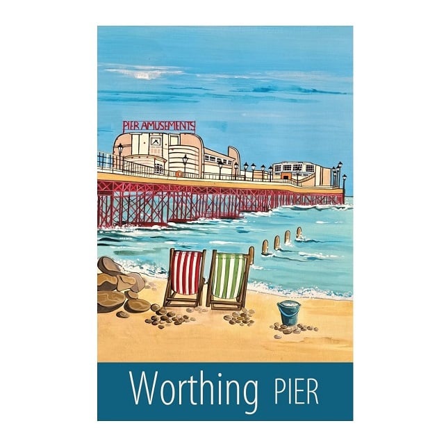 A contemporary travel poster style print of Worthing'slovely Pier, from my own original acrylic painting.