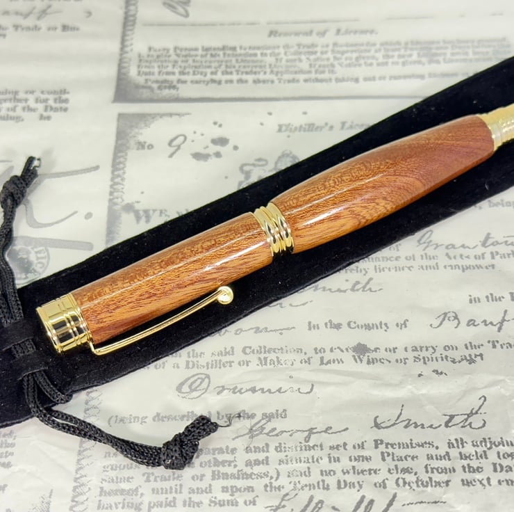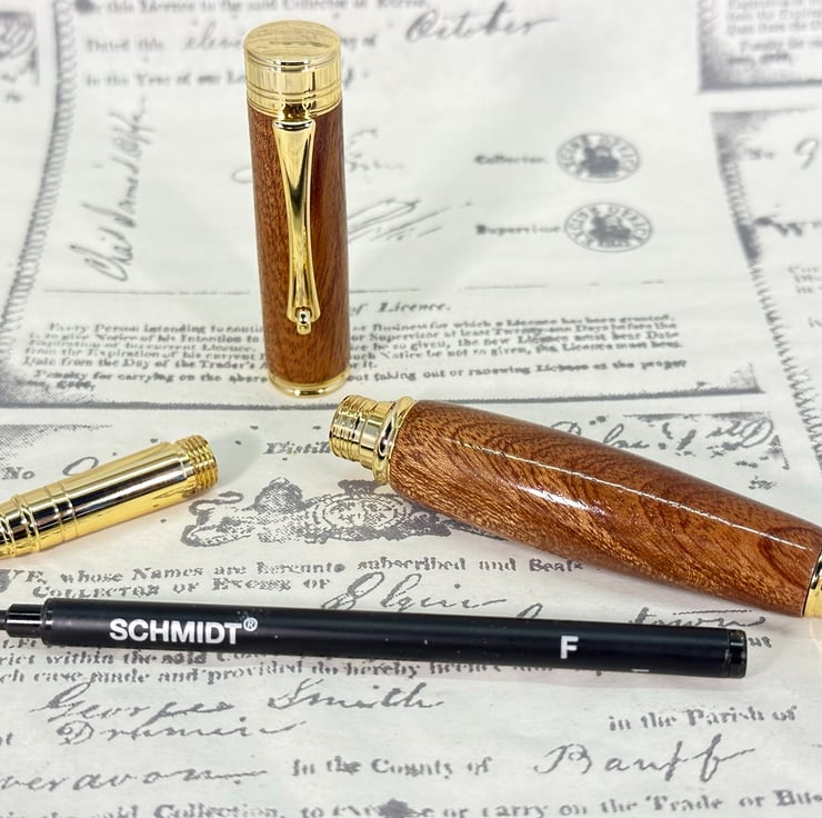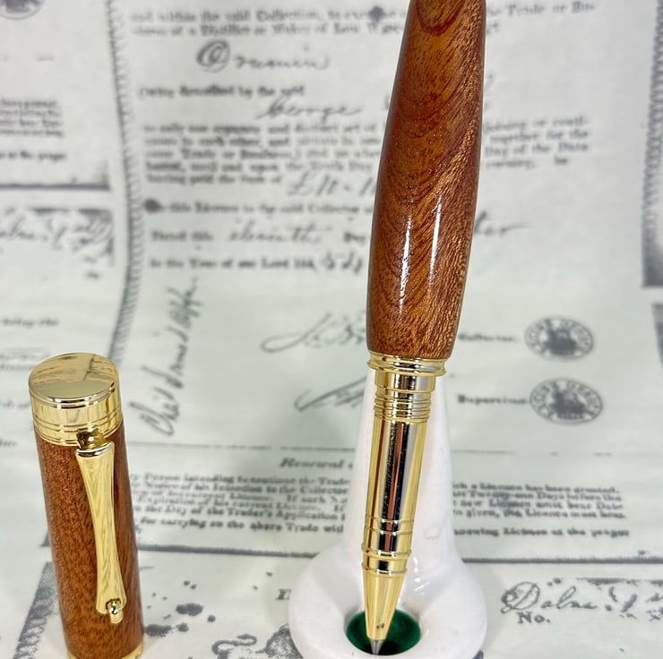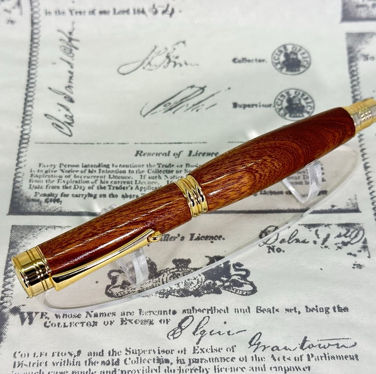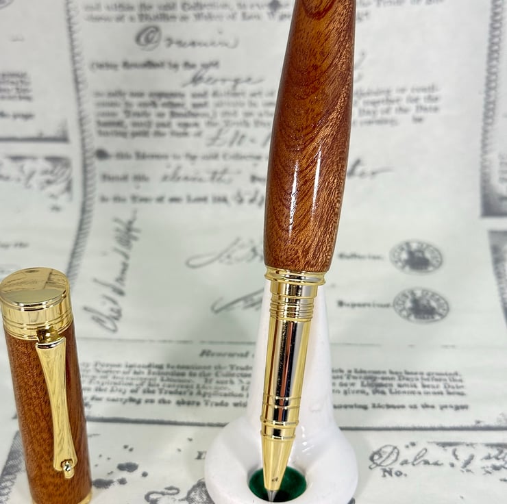 This is a Byron Rollerball pen in 24 carat gold plate with a Rosewood body finished in a lacquered and polished coating; features a rotating wheel pocket clip, comfort grip nib section.