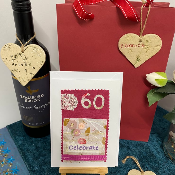 Deep pink taffeta with multi-coloured leaf print stitched on top. enhances with antique lace and the word 'celebrate'. 3 buttons an bright pink ribbon complete.
