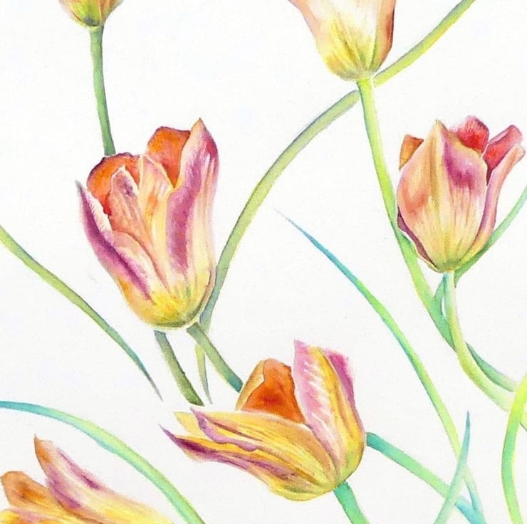 A botanical watercolour of exquisitely delicate coral-pink tulips with entwined stems. This simple composition emphasises the pure form and fragile beauty of these spring flowers.