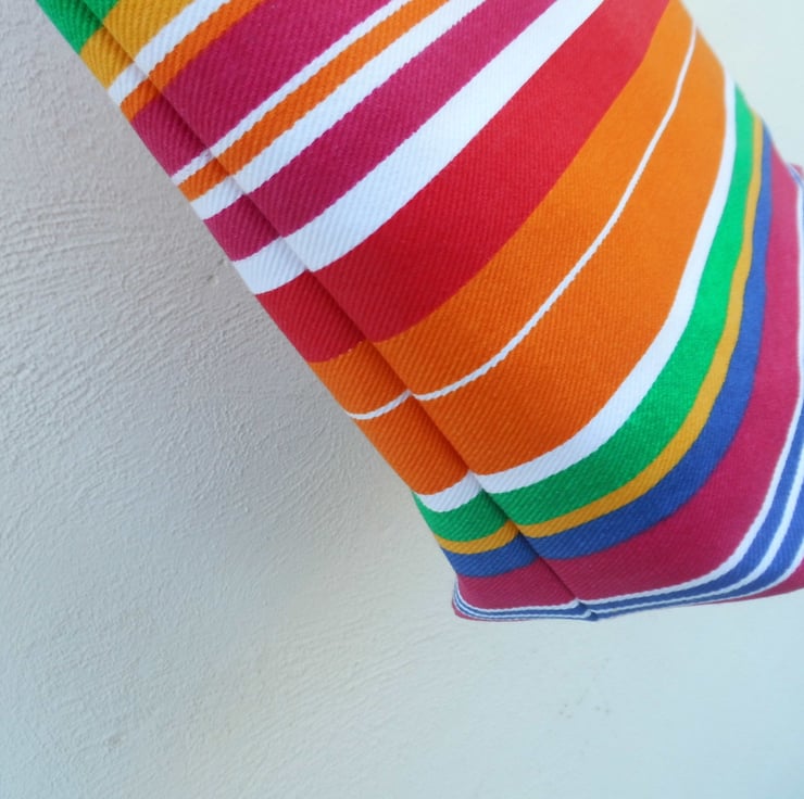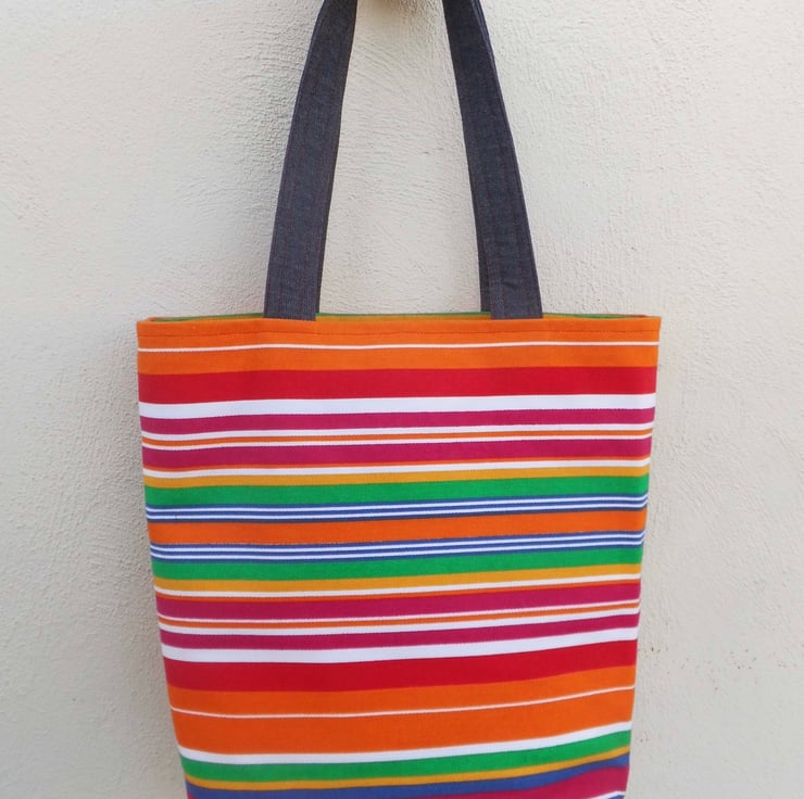 I have made this bag using a heavy weight cotton fabric in brightly coloured deck chair stripes of orange, red, blue green and yellow. It is faced at the top with the same fabric for a professional finish and then the lower half is lined with cream polyester/cotton. I have inserted a chunky key ring in one of the side seams using a denim loop, handy for clipping a purse or keys safely. Fully lined so there are no raw edges inside.