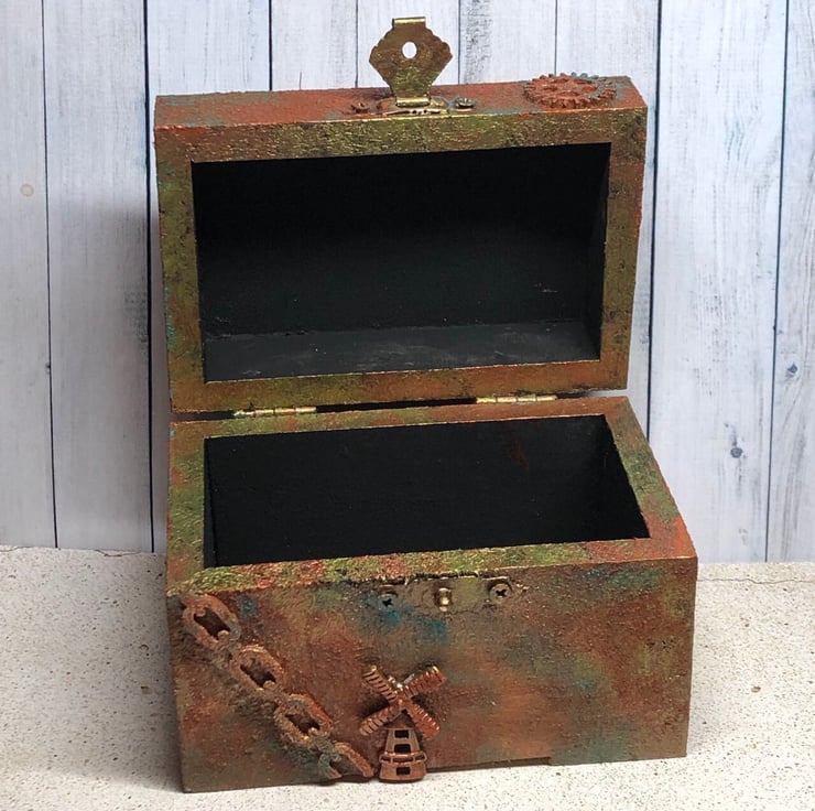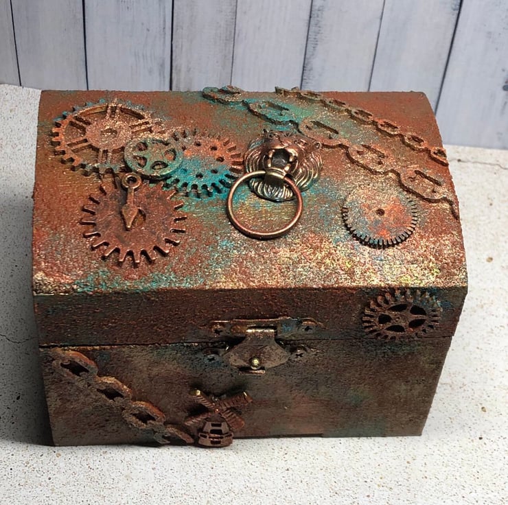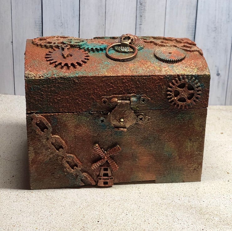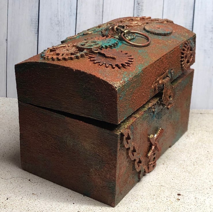 Steampunk themed wooden treasure chest box with metal and wooden cogs and charms on the lid and a fabulous rusty and patina finish.