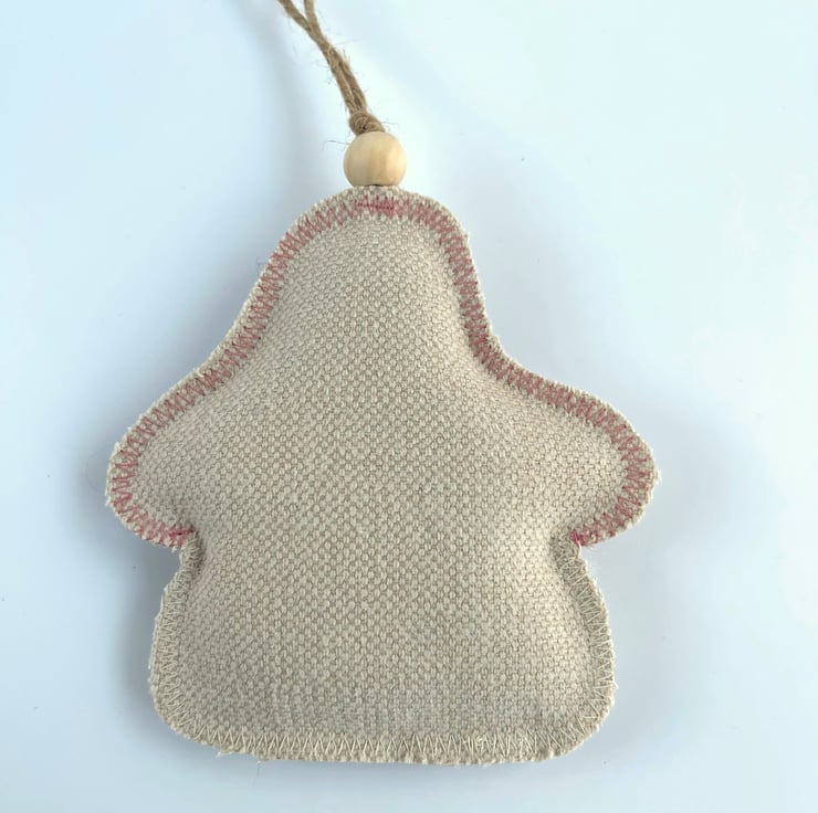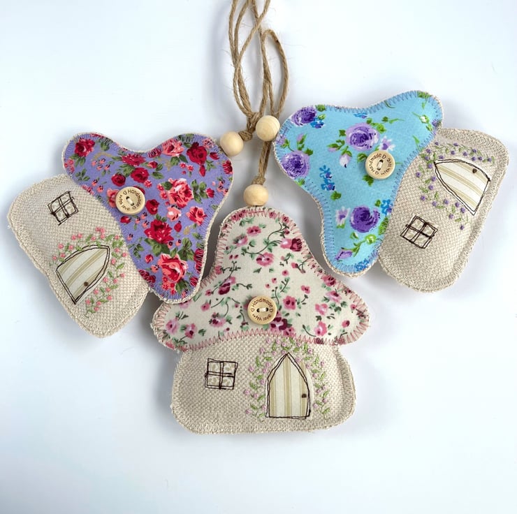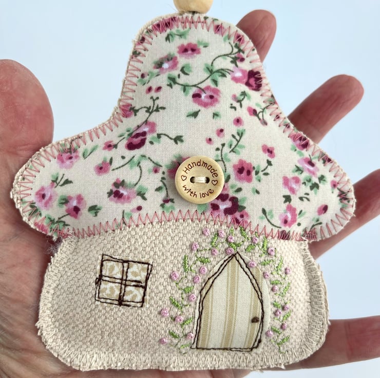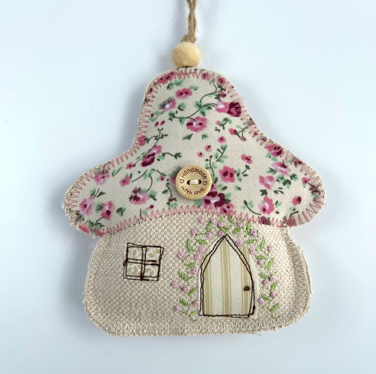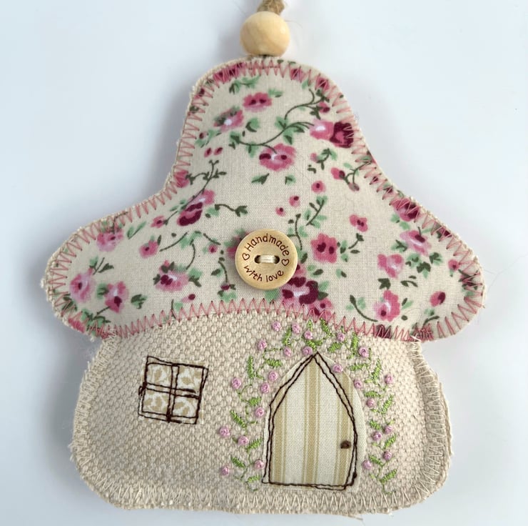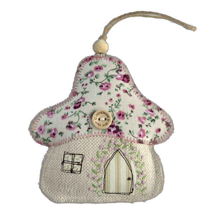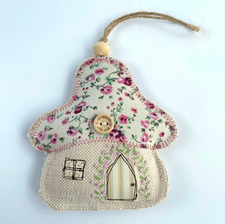 Cream and pale pink mushroom house hanging decoration. This lovely decorative toadstool house has been made from cream upholstery fabric, with a floral print fabric overlaid for the mushroom top/roof. The pretty print fabric is cream with a ditsy floral pattern in shades of pink and green. I’ve embellished the mushroom top by adding a natural wood button with the words “Handmade with love” and two tiny hearts inscribed on it. The toadstool house stem has an arch-shaped door in cream and beige striped fabric, and a square quartered window in cream and beige leafy fabric. Around the door, I’ve machine-embroidered a green leafy pattern, to which I’ve then added hand-embroidered pale pink French knot flowers. The house is finished with a natural wooden bead, to resemble a chimney, and has a jute hanging loop. The house is lightly stuffed with polyester hollow fibre filling.