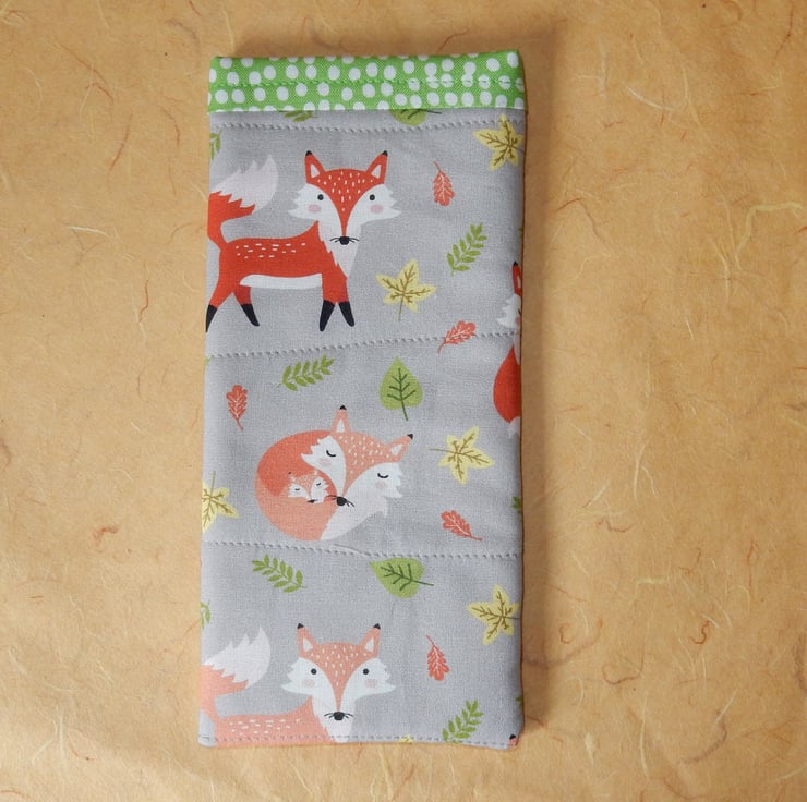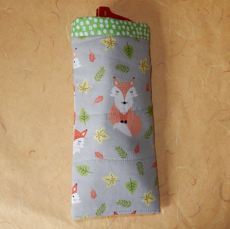 This glasses case features cute foxes among colourful leaves. It is made from a cotton fabric with a green print trim and lining. This is a slip in style glasses case, if you require a case which fastens please view my other listings.