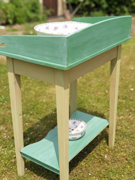 It has been painted in Fusion Park Bench and then had a coat of Liming wax and clear wax for durability. The legs and skirt have been washed in Cornish Mineral Paint Kelp.