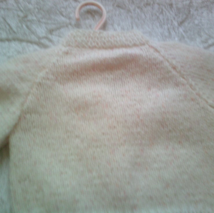 It is made in creamy pink yarn with pink flecks with raglan sleeves.
