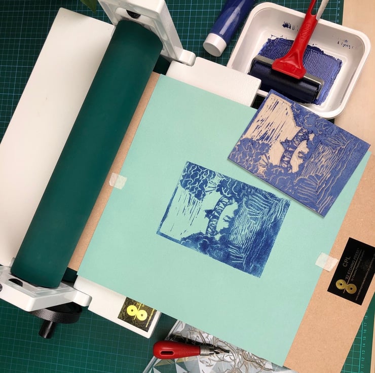 The distance between the two rubber rollers can easily be adjusted by as much as 10-15mm thus making it great for lino-cut printing too!