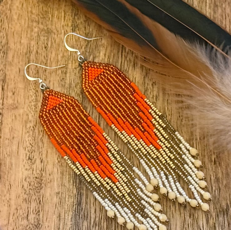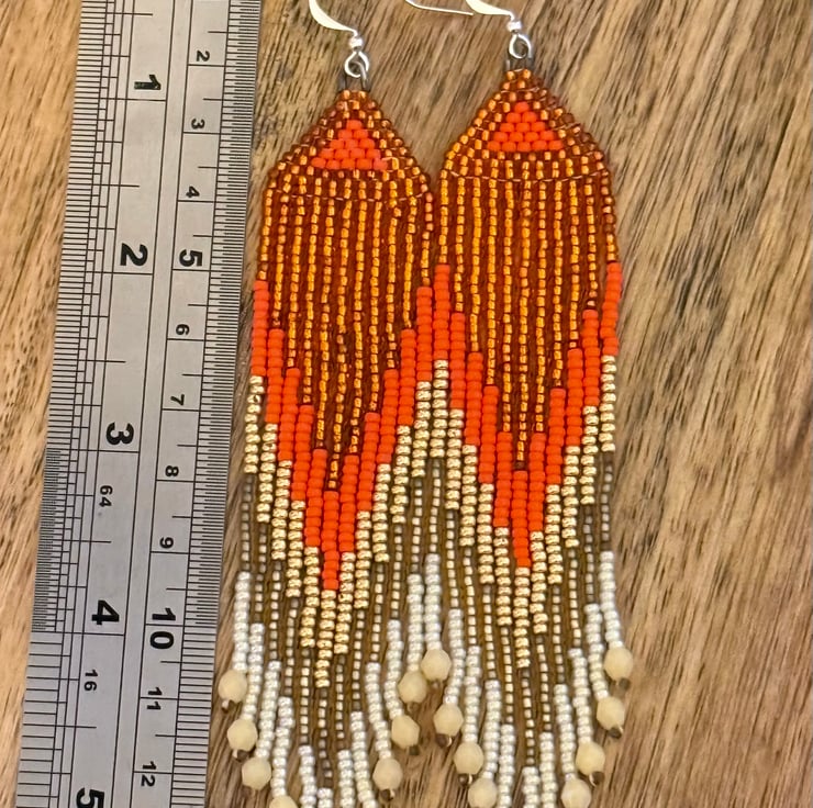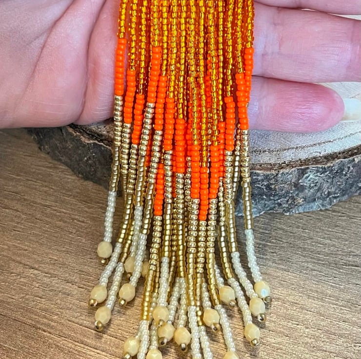 These earrings have been handmade with an assortment of cream and orange tone beads. The top section is made with transparent and opaque orange beads that have been handwoven into a triangular shape. Hanging below is a beadwork fringe made up of 11 strands that forms a chevron pattern. The colours of the fringe changes from transparent orange to opaque orange, gold, sheer gold and cream. Finishing each strand is a lovely cream coloured fire polished Czech glass bead.