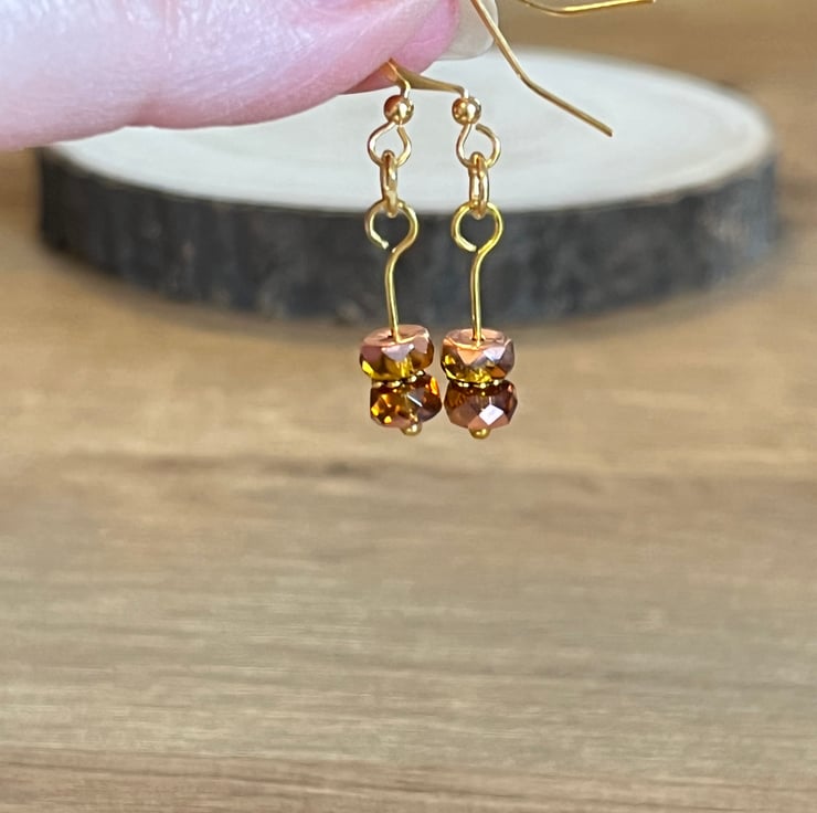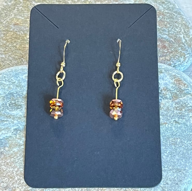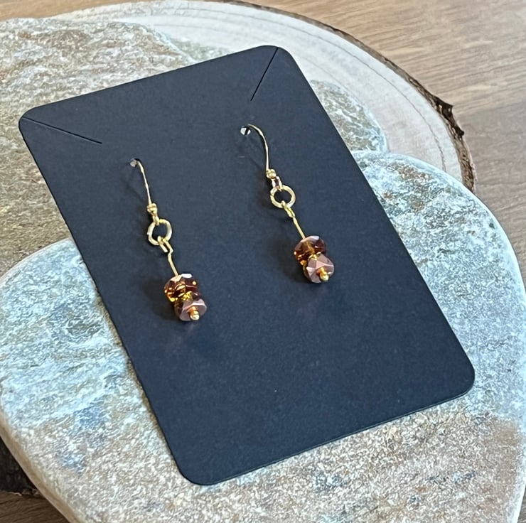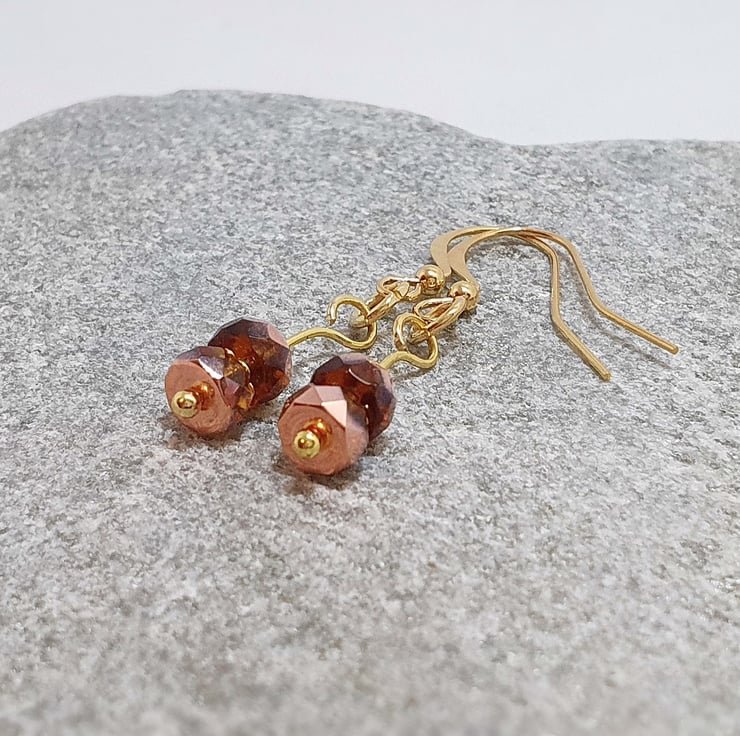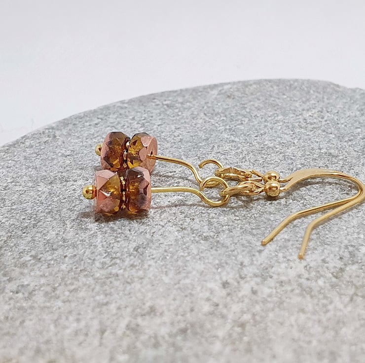 These earrings are elegant and delicate, featuring Czech glass beads with a rose gold hue. The beads have a 6 mm barrel shape and a dual-tone design: one half is a transparent deep pink, while the other half is an opaque metallic rose gold. They also have a faceted fire-polished finish that makes them sparkle beautifully.