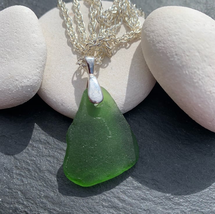 Dark green and silver always look lovely together. The smoothness of this seaglass lends itself to this pendant. Enjoy!