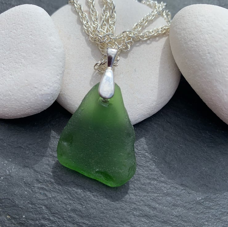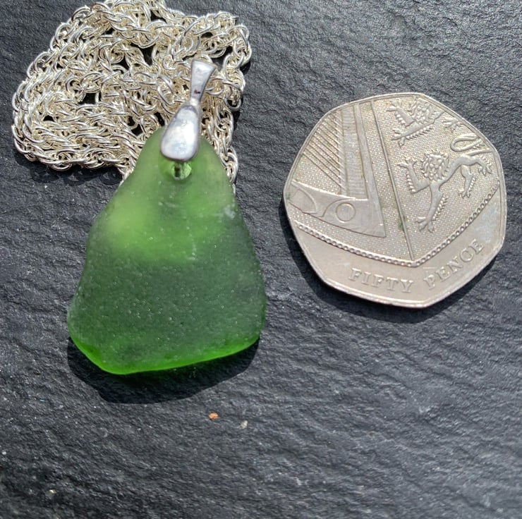 This beautiful smooth and slightly curved triangular piece of deep green seaglass was collected from Withernsea beach in East Yorkshire. It is not a uniform shape as the seaglass has not been changed in any way after it was collected from the beach. It has been drilled at one tip and has a silver plated pinch bail to join it to an 18 inch silver plated rope chain. The piece measures approx 3x3x2cm and is approx 0.3cm thick.