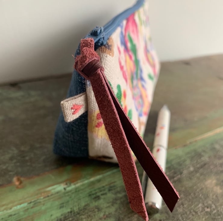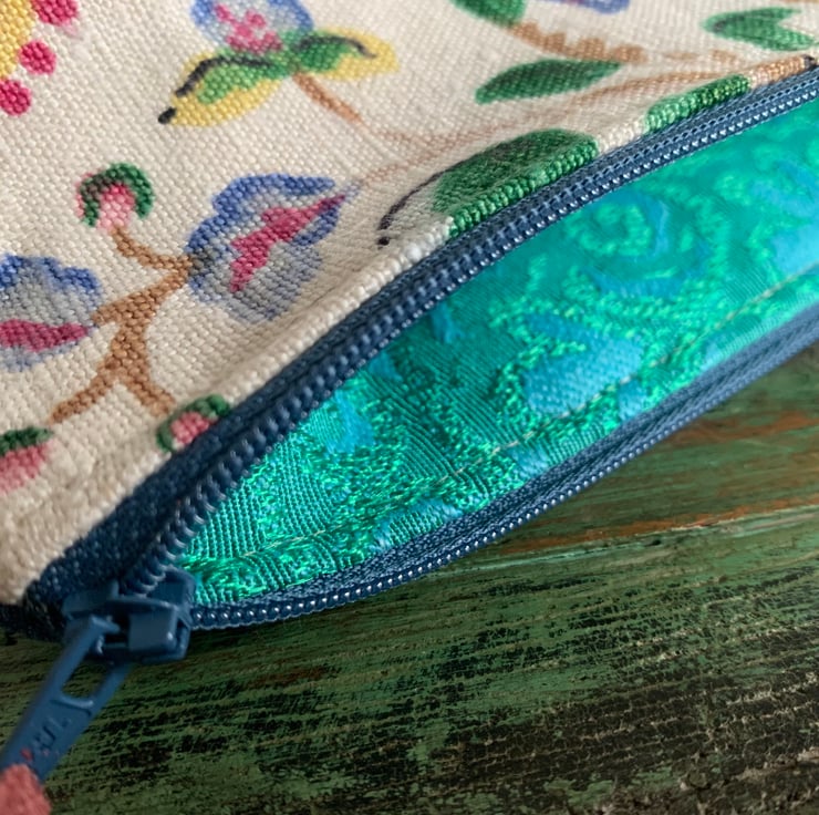 Pretty zip pouch made from colourful vintage floral linen and reclaimed denim from a pair of jeans. The pouch is lined with vintage curtain fabric in rich blue and green with a beautiful sheen.