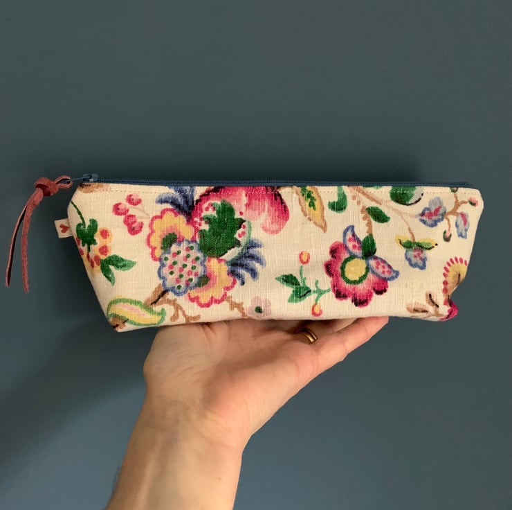 The pouch is a good size for a pencil case, for keeping crafting tools tidy or for cosmetics. A layer of interfacing gives it some structure. The base is boxed to give the pouch more volume.
