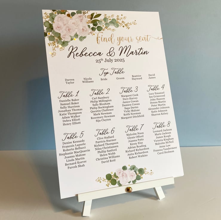 2. Personalised TABLE plan sign in A2 size (FOAMBOARD with laminate finish - printed onto 5mm foamboard (sturdy lightweight board) and laminated on one side,