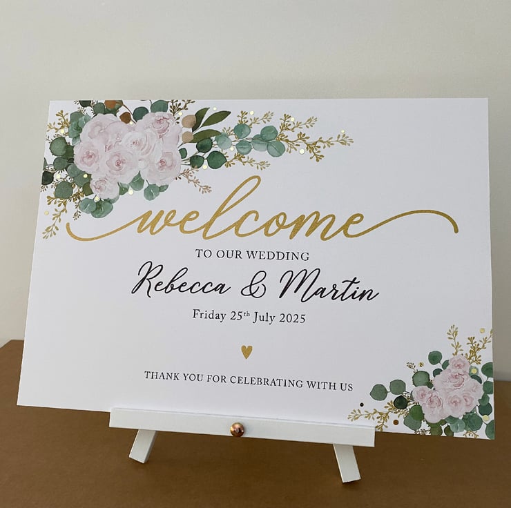 1. Personalised WELCOME to the WEDDING sign in A3 size (FOAMBOARD with laminate finish - printed onto 5mm foamboard (sturdy lightweight board) and laminated on one side,