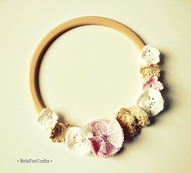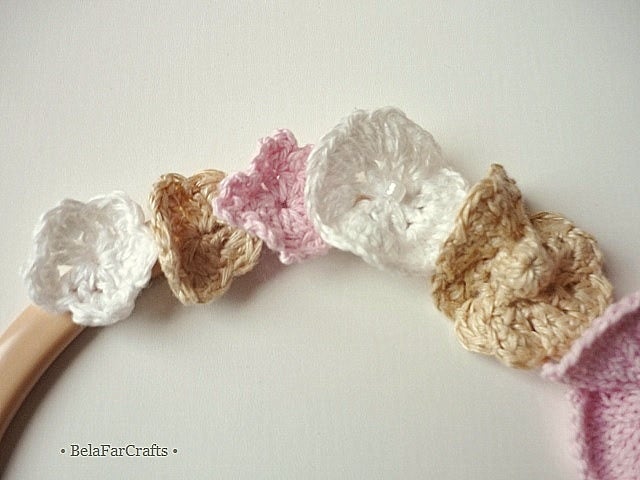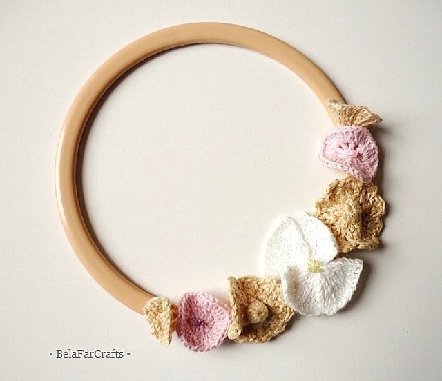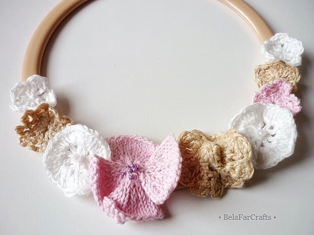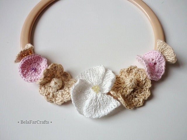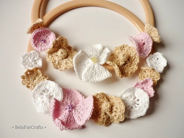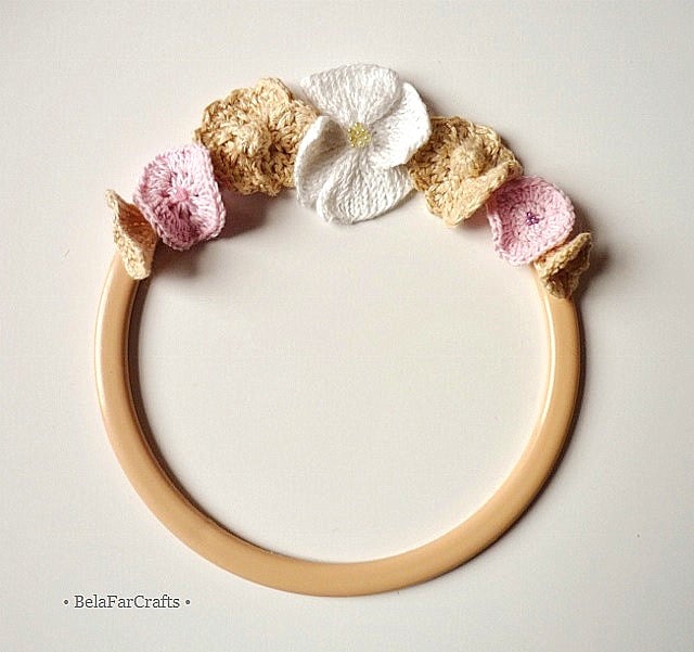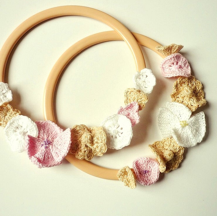 My hand knitted/crocheted flowers in fine linen (white & beige) and cotton (pink).
