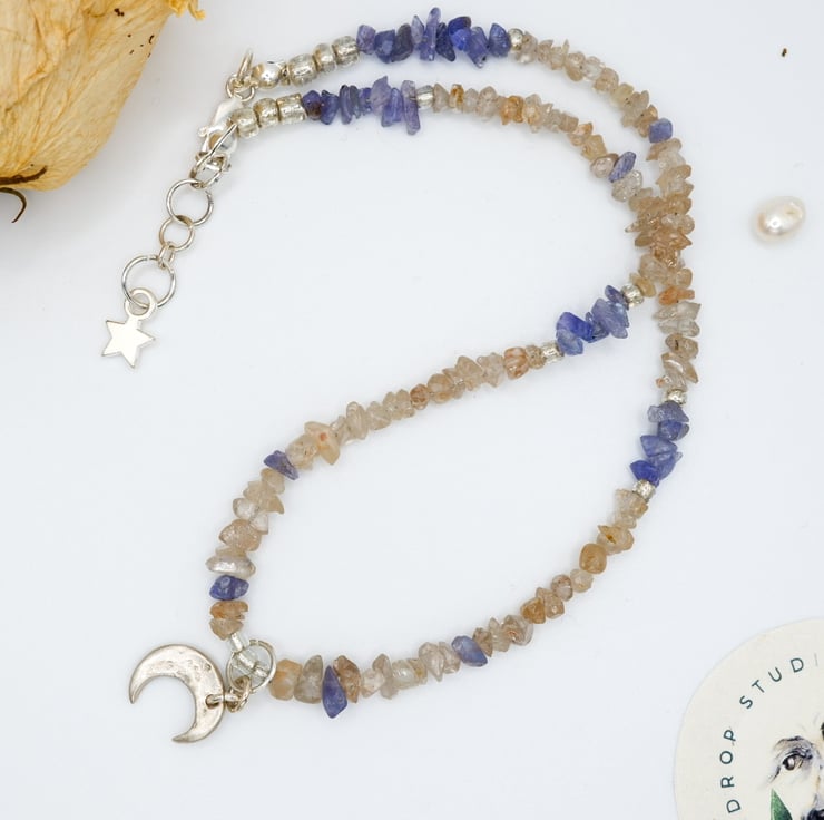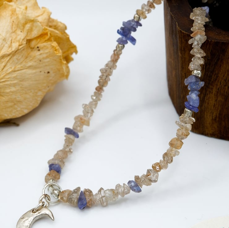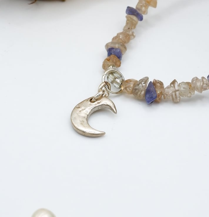 This necklace brings together lilac blue Tanzanite chip beads and stunning peach Zircon gemstones; a meticulously crafted solid fine silver crescent moon charm pendant finishes the piece.