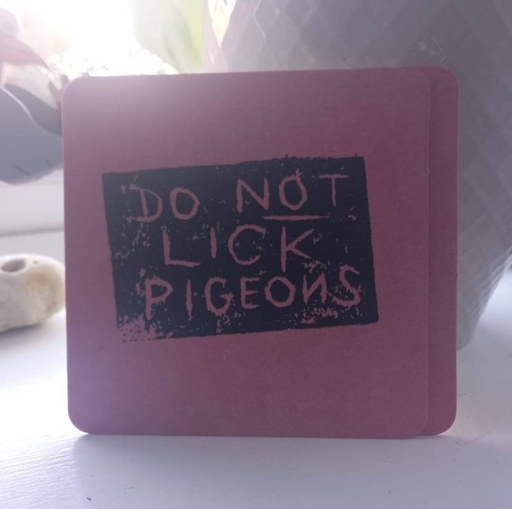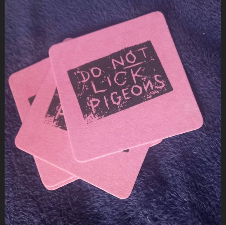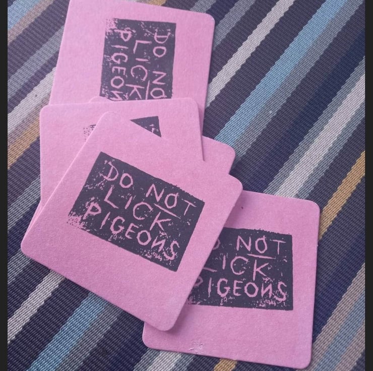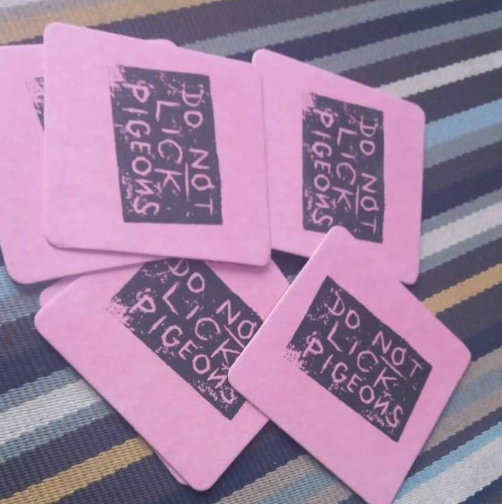 Years ago, I worked in Sheffield city centre and there was a bit of graffiti near the cathedral that always made me laugh - "Darren is a pigeon licker" (the name may have been different). When I was asked to make some beer mats for a mate's poetry night in a pub, I did a practice one and randomly chose "do not lick pigeons" - one of the Ns is round the wrong way (I did it freehand and lino printing is always backwards!)....people liked them so I started printing them off......but I couldn't keep up with demand so I got 500 printed professionally.