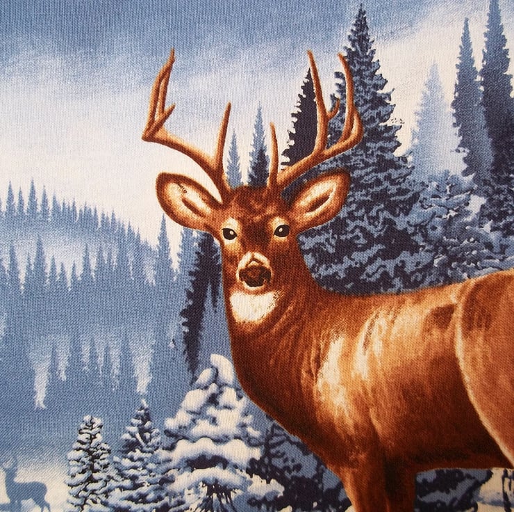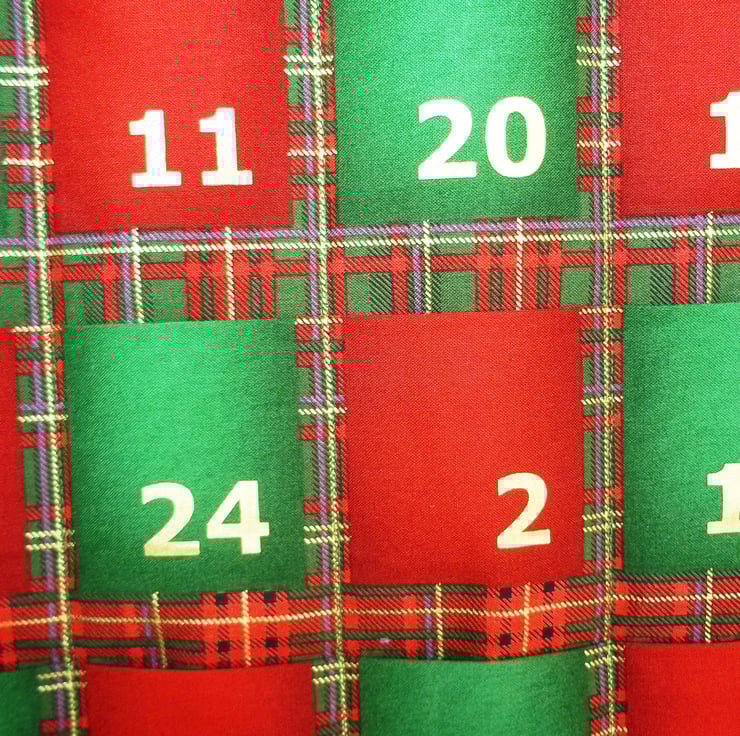 This reusable fabric advent calendar has red and green numbered pockets arranged under a snowy festive scene of deer and pine trees, with a tartan background it really has that Scottish highland feel, it has a complimenting backing fabric of holly wreaths with tartan bows. Fill the pockets with little treats, ideas for festive themed activities, memories of the past year and more, and reuse year after year making this become a treasured family item. Measuring approximately eighteen and three quarter inches (47.5 cm) wide and twenty six and a quarter inches (66.5 cm) deep including hanging loops. The calendar has a light wadding filling to give it some plushness and rows of stitching added to aid with structure. Designed as a decoration not a toy. Created in a smoke and pet free home.