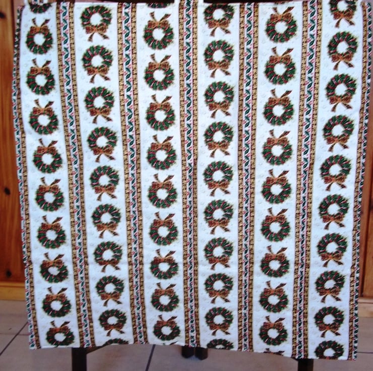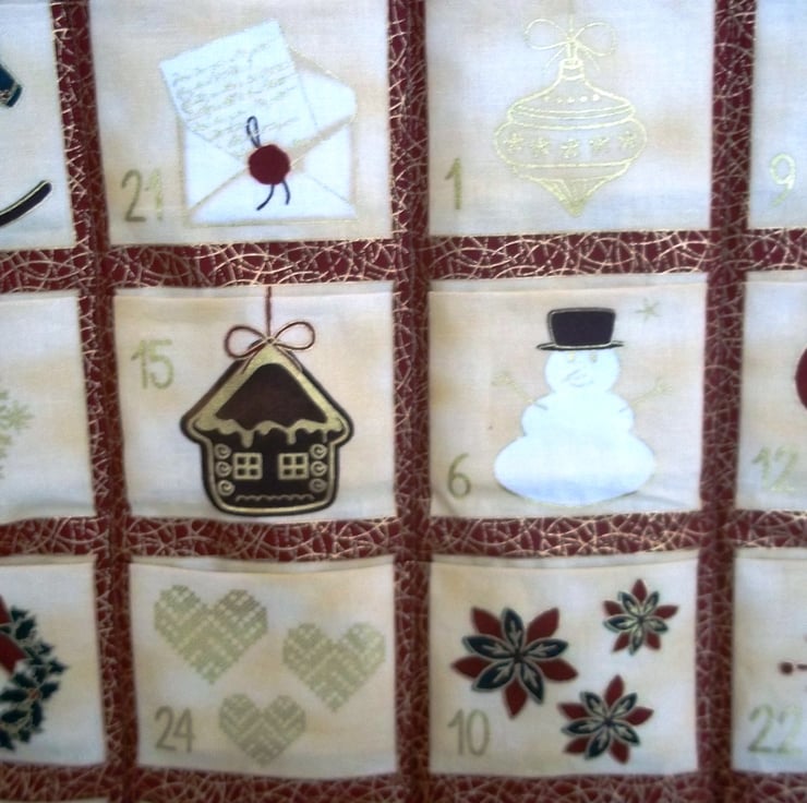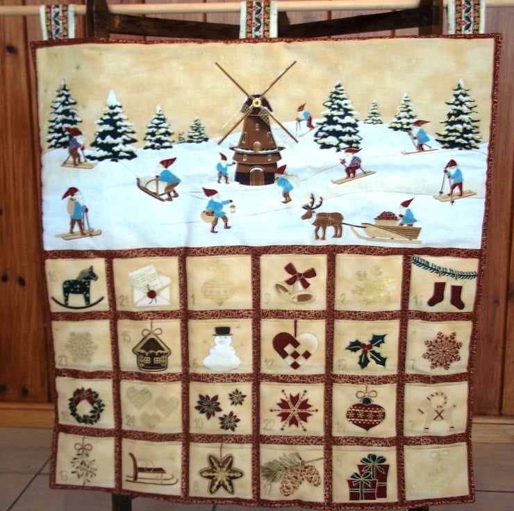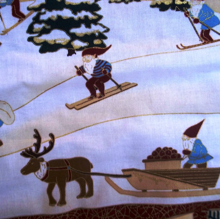 This reusable fabric advent calendar has pockets each with its own festive motif arranged under a merry snowy scene of gnomes going about their day with a windmill and Christmas trees, it has a complimenting backing fabric of holly wreaths with tartan bows. Fill the pockets with little treats, ideas for festive themed activities, memories of the past year and more, and reuse year after year making this become a treasured family item. Measuring approximately twenty two inches (56 cm) wide and twenty four and three quarter inches (63 cm) deep including hanging loops. The calendar has a light wadding filling to give it some plushness and rows of stitching added to aid with structure. Designed as a decoration not a toy. Created in a smoke and pet free home.
