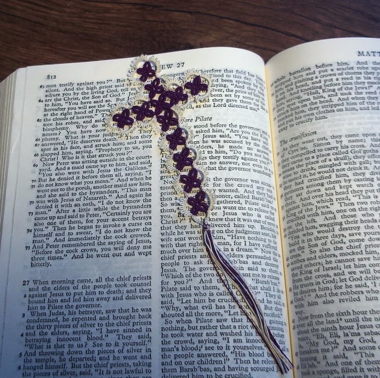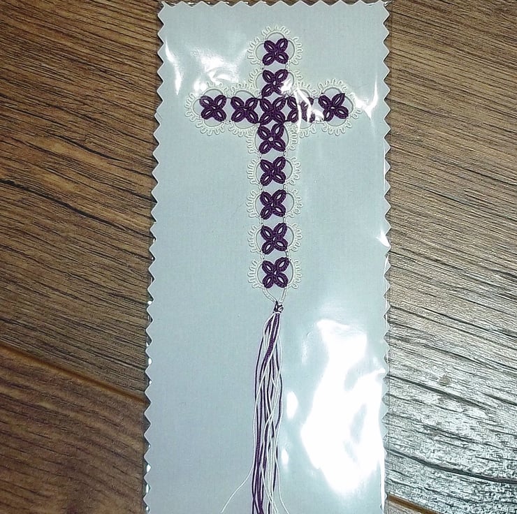 Tatting is an intricate form of knotted lace made with a small shuttle. Here a Cross pattern has been created with a rich purple centre and cream edging finished with a multi stranded loose cotton tail. This is a lovely item to save your place in your favourite book, and would also make a charming present ideal for a christening, confirmation or even wedding. This pattern has been designed by me. Approximate measurements are six and three quarter inches (17 cm) long by two and a half inches (6.5 cm) at the widest point. Bookmark will come presented on a card backing wrapped in clear cellophane, it can be released from the card backing by snipping the cotton on the rear of the card. Created in a smoke and pet free home.