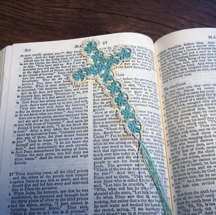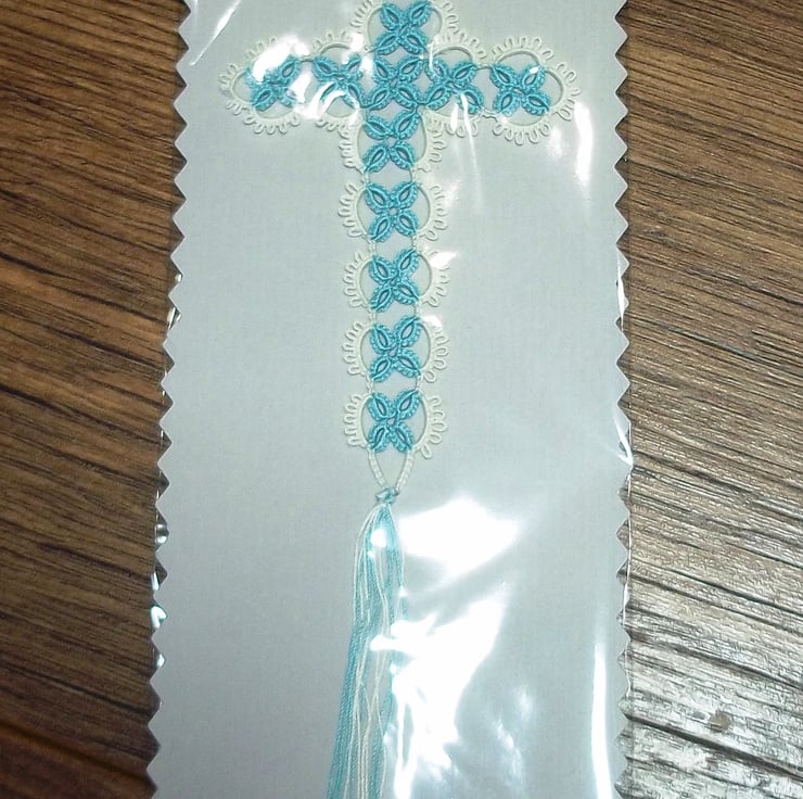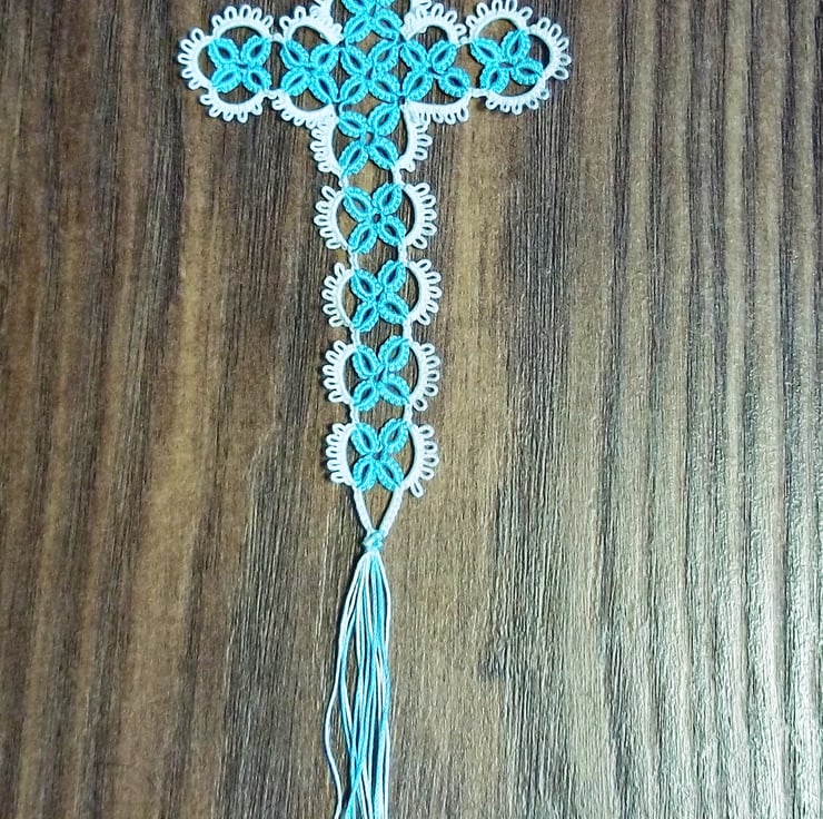 Tatting is an intricate form of knotted lace made with a small shuttle. Here a Cross pattern has been created with a turquoise centre and cream edging finished with a multi stranded loose cotton tail. This is a lovely item to save your place in your favourite book, and would also make a charming present ideal for a christening, confirmation or even wedding. This pattern has been designed by me. Approximate measurements are six and three quarter inches (17 cm) long by two and a half inches (6.5 cm) at the widest point. Bookmark will come presented on a card backing wrapped in clear cellophane it can be released from the backing by snipping the cotton on the rear of the card. Created in a smoke and pet free home.