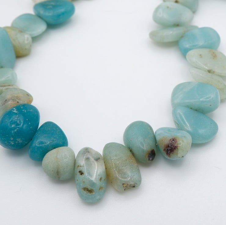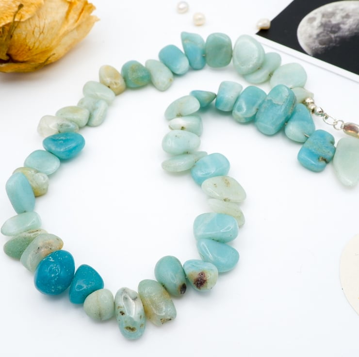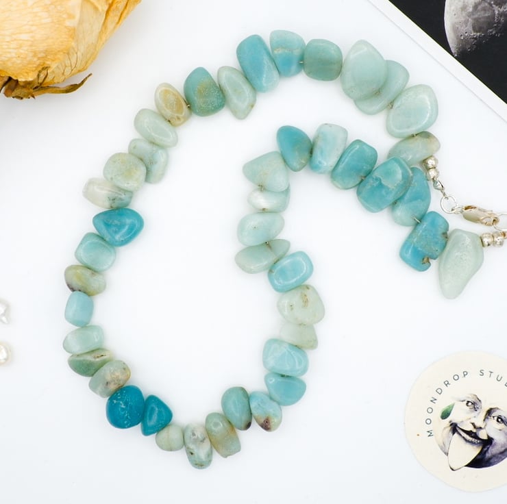 Handmade with love, this necklace features a mesmerizing blend of graduated green-blue chunky Amazonite gemstone nugget beads and sterling silver components.