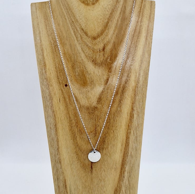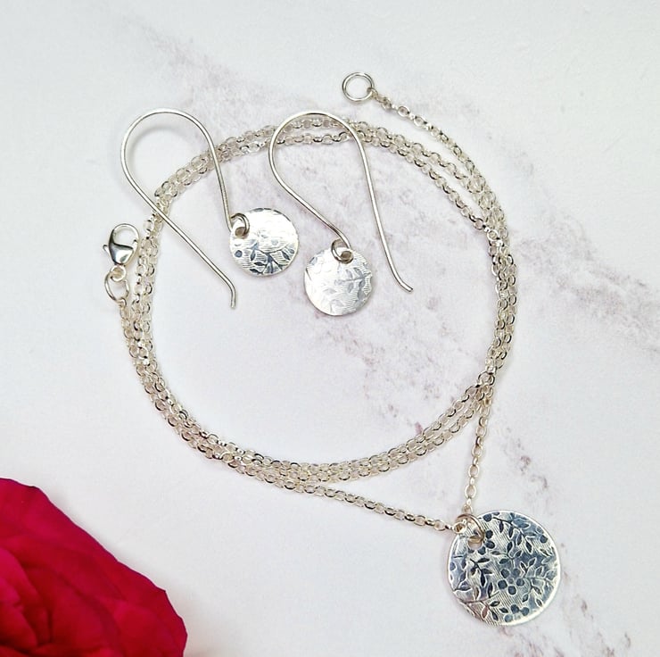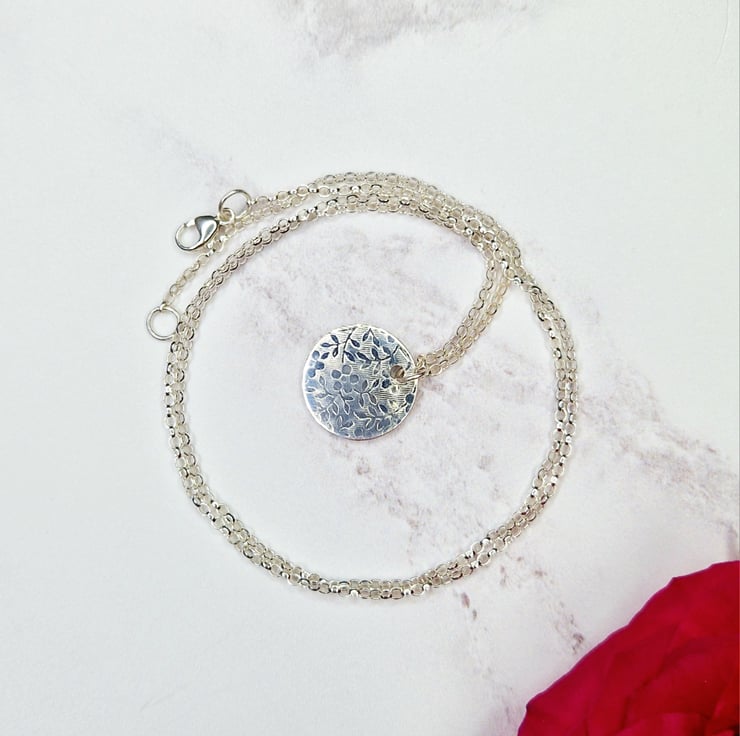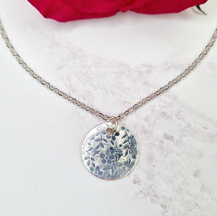 The 15 mm silver disc has a small dainty flower and leaf design embossed on it, the pattern is raised, on to the front of the hand polished disc. The disc hangs on a simple but elegant slender mid length, 50 cm, chain that fastens with a trigger clasp. All the components used in this necklace are made of sterling silver.