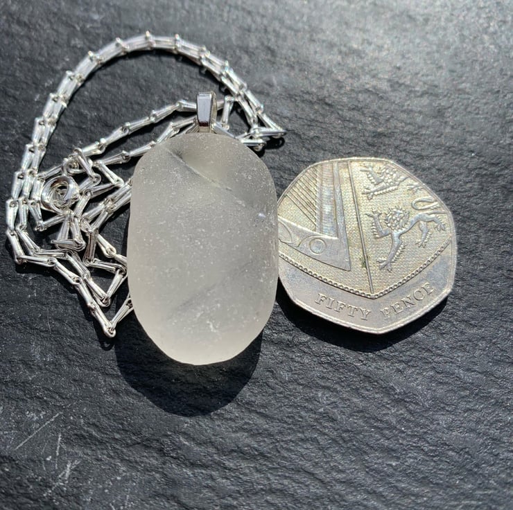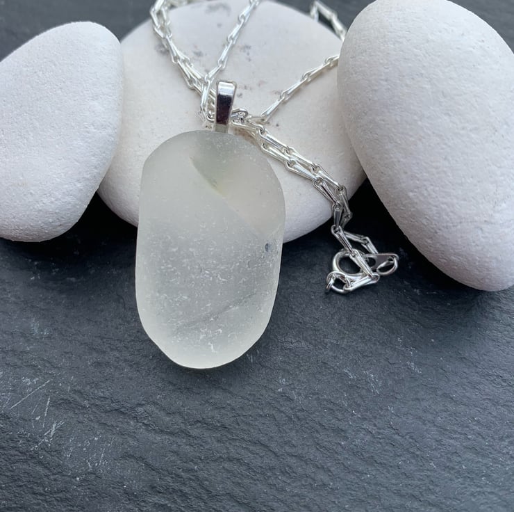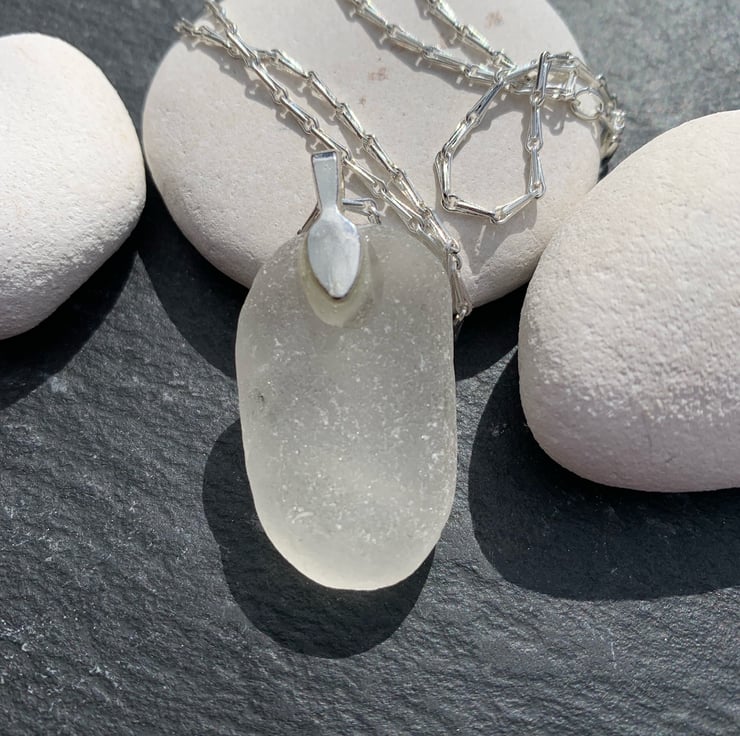This smoothed white piece of seaglass was collected from Withernsea beach, East Yorkshire. It has two lines showing part of its original moulding marks, possibly part of a star shape on the base of a vase. Unfortunately, no way of knowing! It is a round ended rectangular shape, approx 3.2cm at its longest and 2cm at its widest. The silver plated bail is mounted on the unmarked side but this pendant looks great worn either way round.