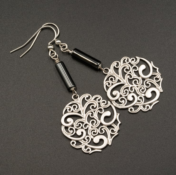 Perfect for the party and holiday season, these lovely detailed filigree large round drops are matt silver plated and hang below a slim 5 x 12mm shiny Hematite tube which is topped and tailed with sterling silver bead caps.