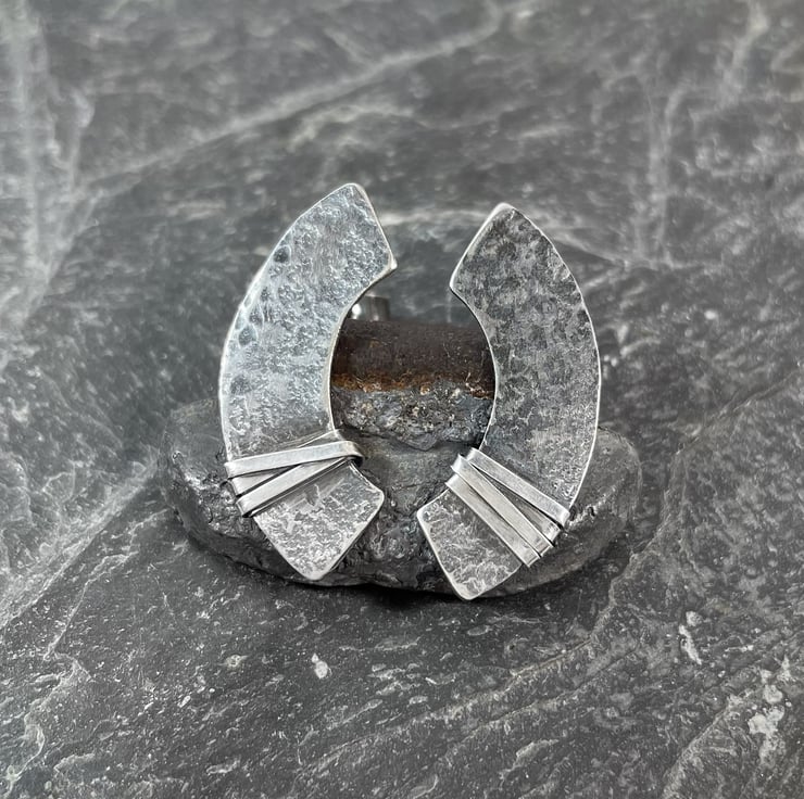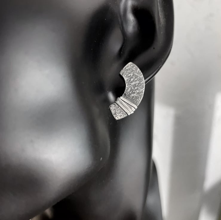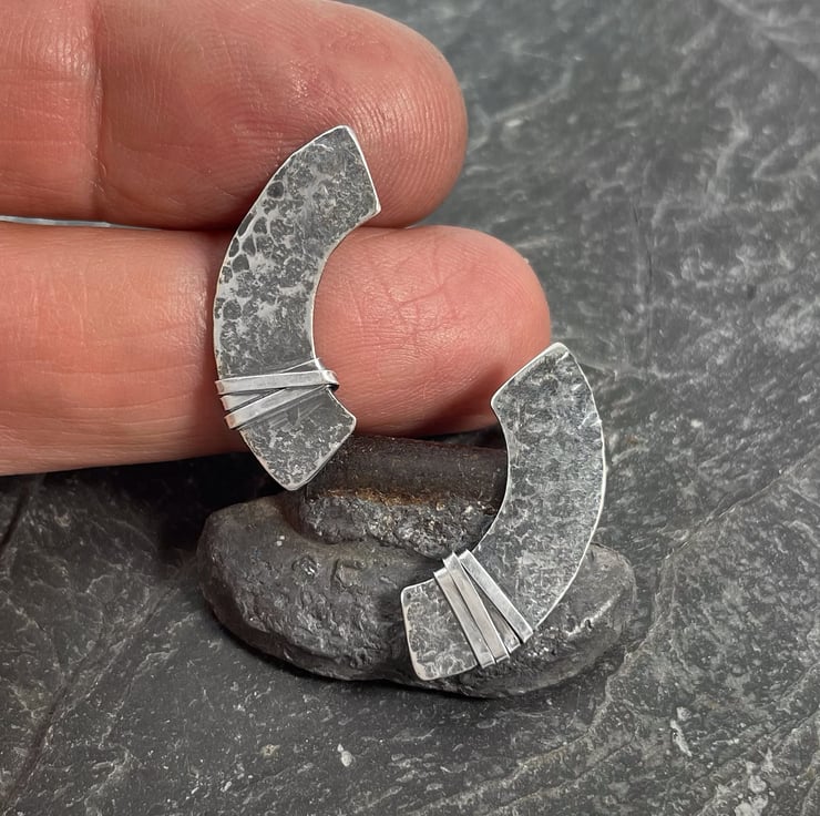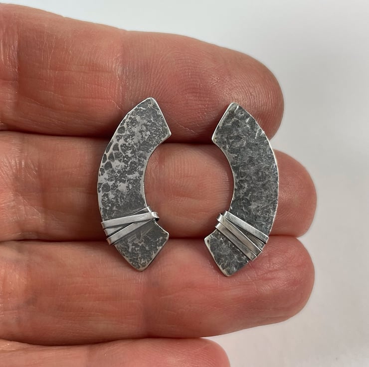 Curved strips if silver have been beaten and oxidised. They have a wrap of bright flat fine silver soldered towards the base.