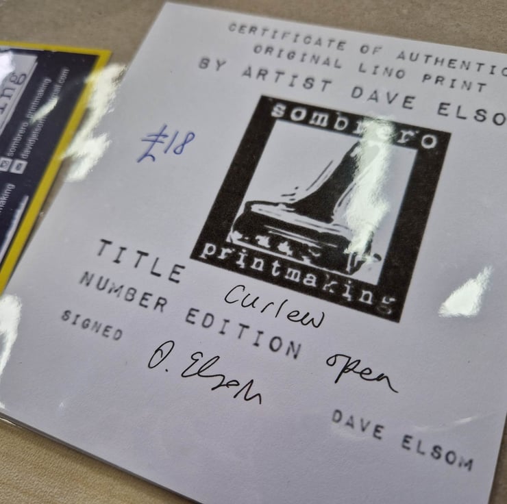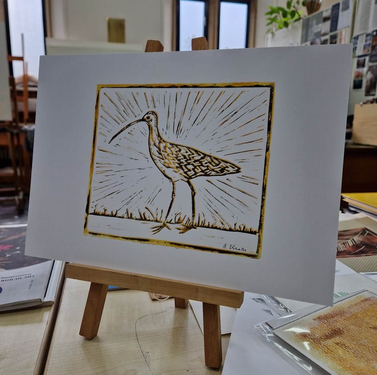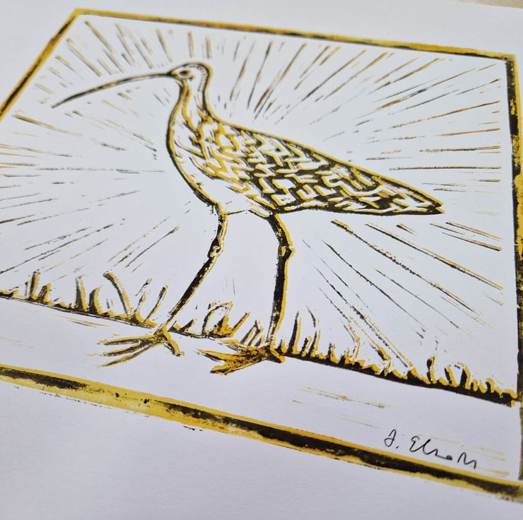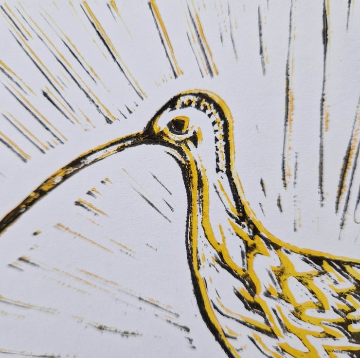 I hadn't heard curlews before, but on a walk at Curbar Edge in the peak district, I saw lots and heard their unique calls. It made me have a look into them when I got home and I ended up making this curlew print. This edition is using two layers - first yellow ochre and then black ink over the top.