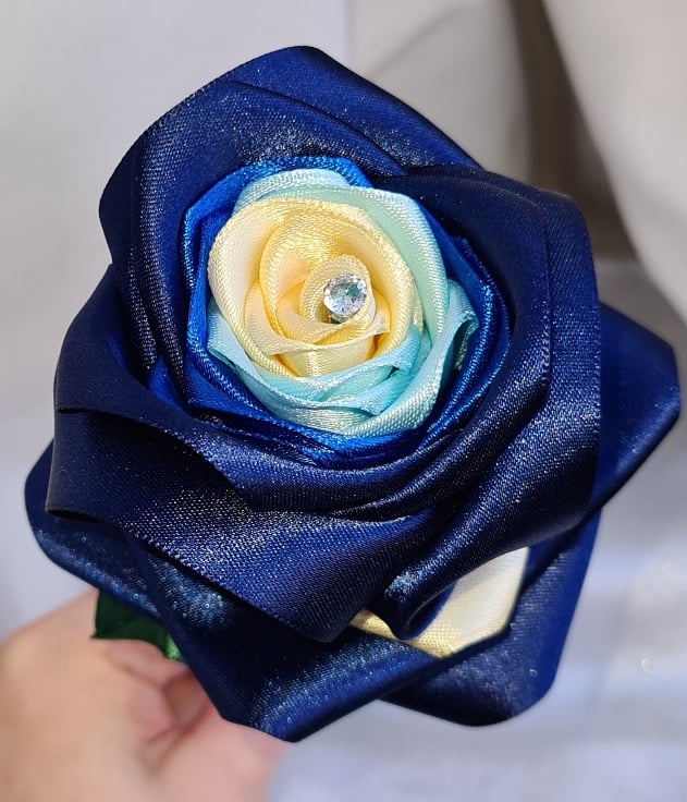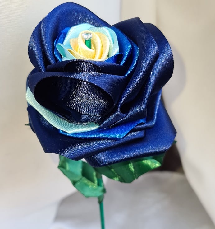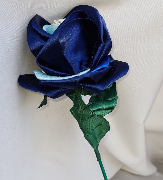 A gorgeous handmade single stem rose (one flower only), made with beautiful, high quality Navy Blue Satin (Berisfords) ribbon, Royal Blue, Baby Blue and Ivory satin ribbons. The stem is made from bamboo (Non-bendy) and painted Green with Dark Green Satin ribbon leaves.